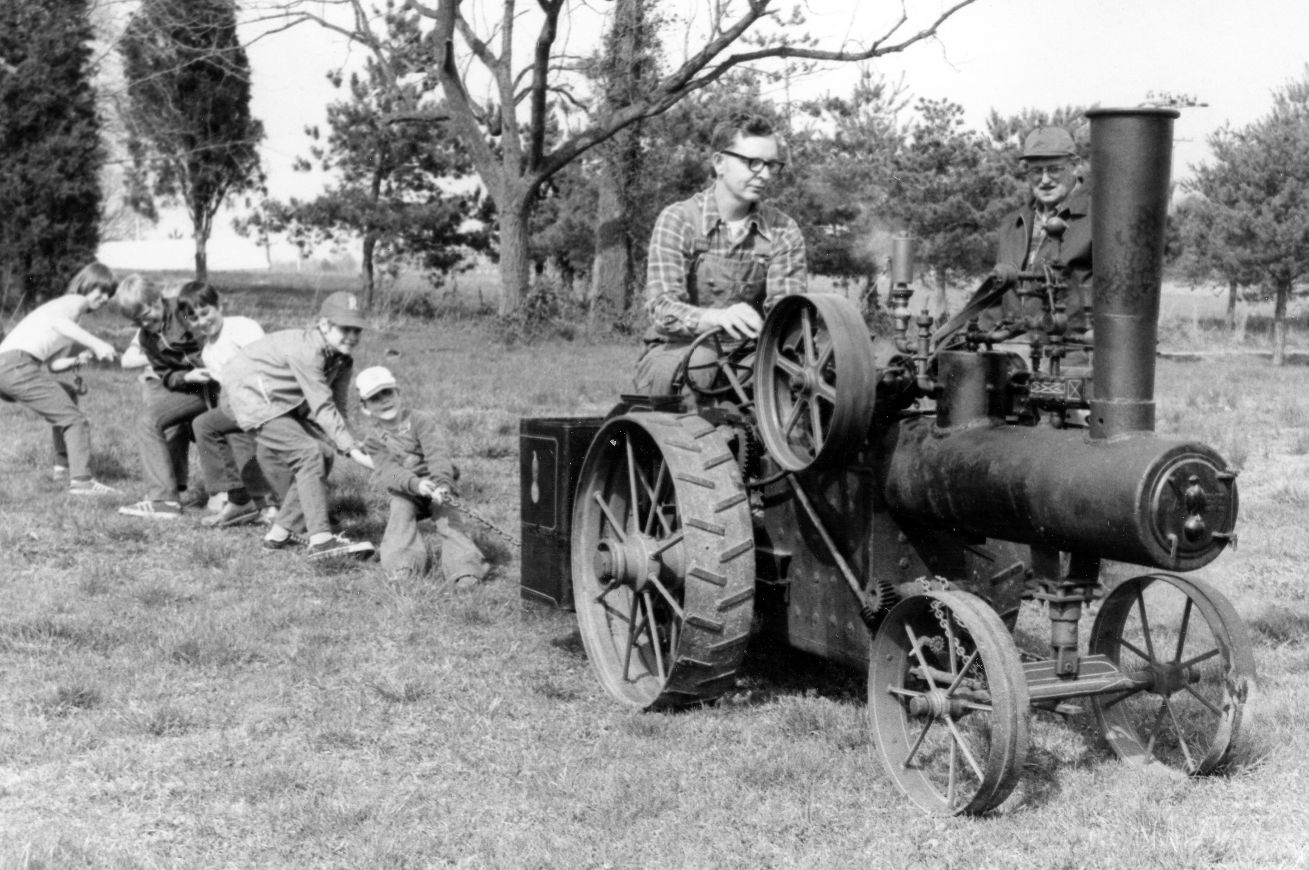 Man drives an old tractor while children tug on attached rope, maybe a tug-of-war of some sort.