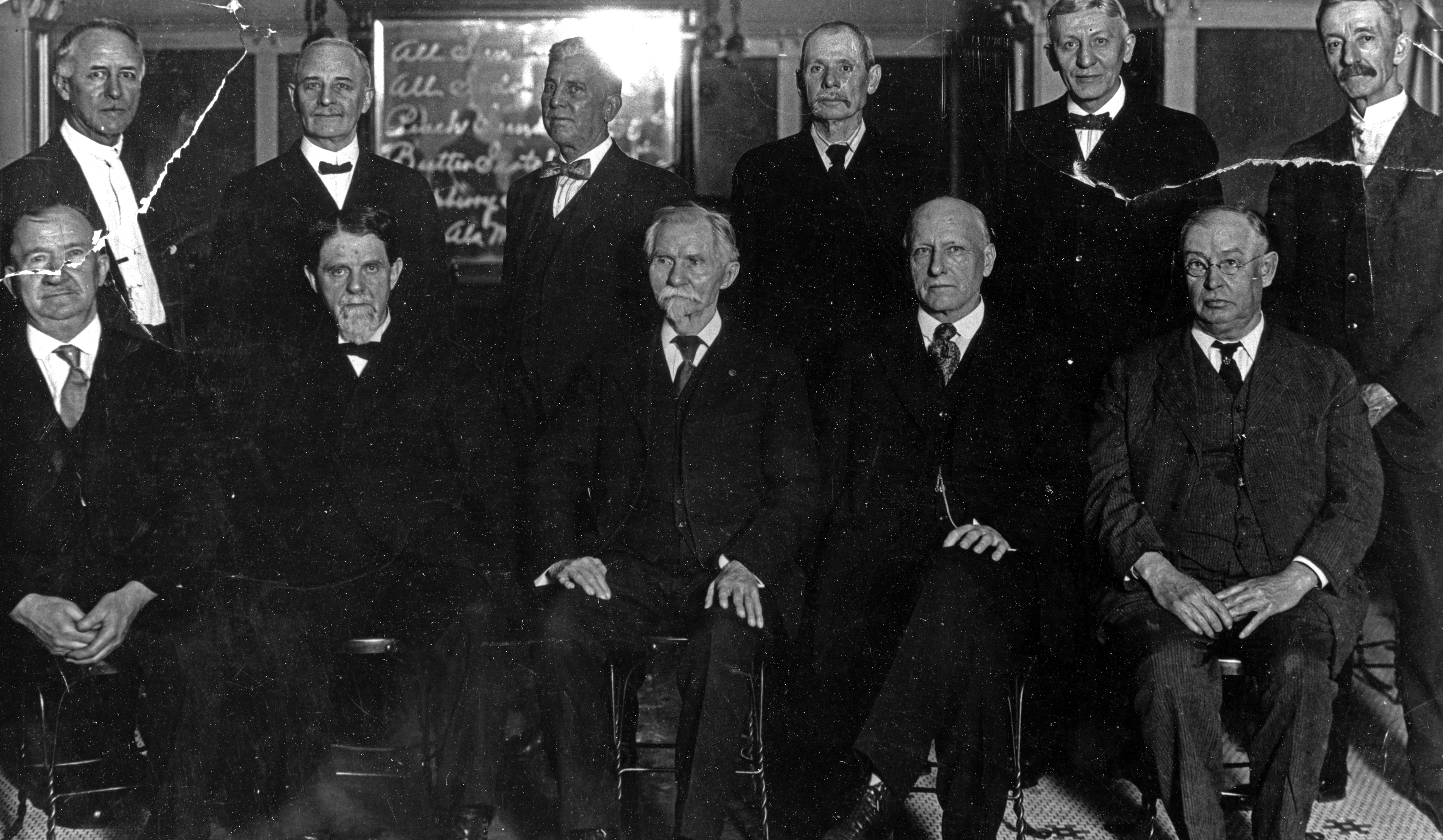Reunion of the Evansville Light guards. The Light Guards were Sons of Union Veterans of the Civil War, the official successor to the Grand Army of the Republic (GAR). Top row: Netter Worthington, William Weintz, Charles A. Url, John E. Bernhardt, Edward H. Mann, John J. Froelich. Bottom row: Fred Miller, William Warren, August Leich, Thomas A. Jenner, George Olmstead. Photograph from the Evansville Journal.