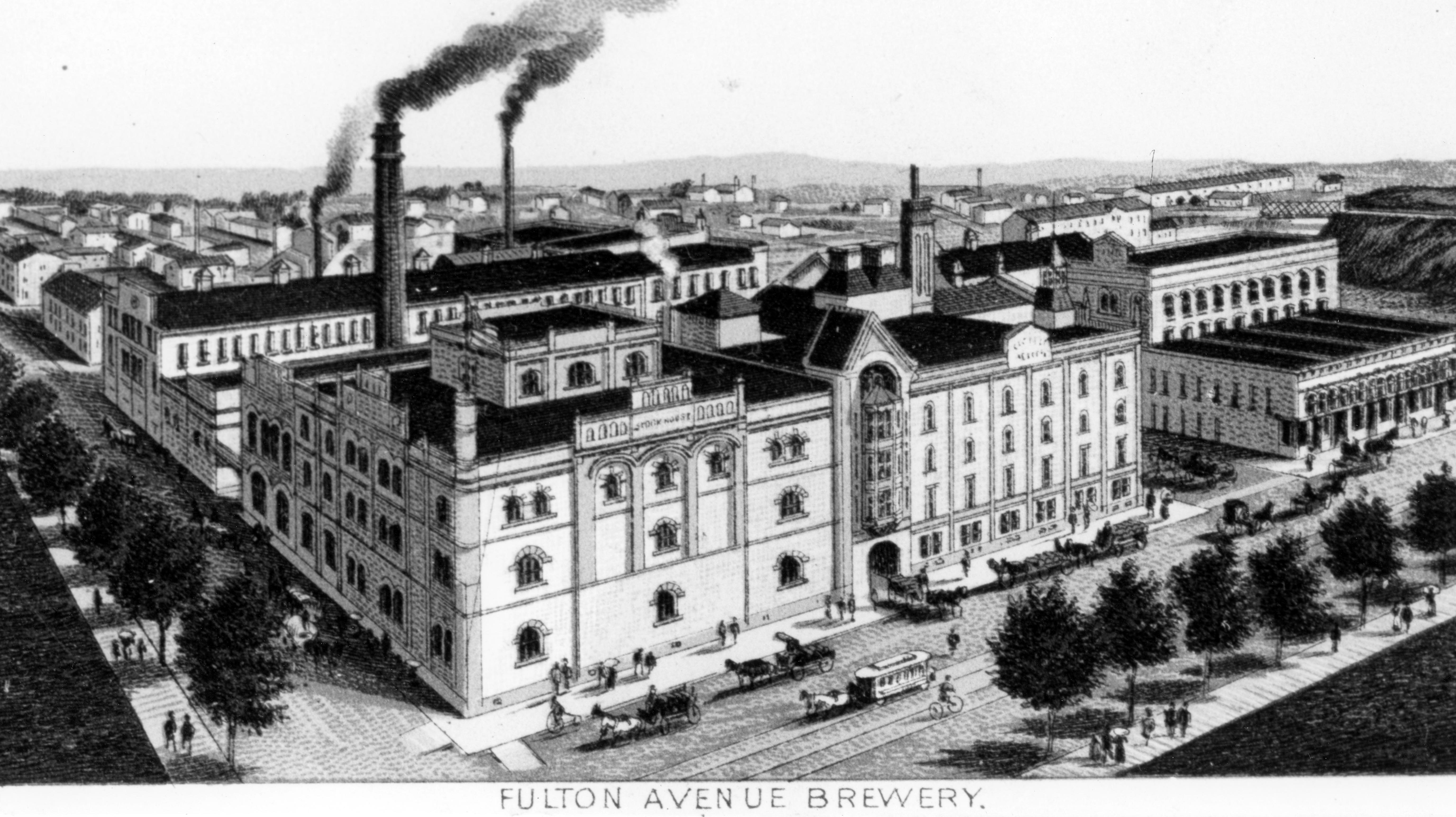 Fulton Ave. Brewery at 330-430 Fulton Ave., on the corner of Pennsylvania St. A brewery was built at this location as early as 1863. The owners built a new brewery in the summer of 1880 across the St. from the Old Brewery. The modern, new Fulton Ave. Brewery was 74feet x 114feet and four stories tall. It was designed by Meinrad Schoenkrechler. This new building is what is pictured here. It suffered major ice storm damage in 1890 and much of what is seen here was torn down or rebuilt. Hartmetz and Son Brewery, Evansville Brewery and Fulton Brewery merged to form the Evansville Brewing Association in 1893 in an effort to protect small breweries. This association was reportedly the result of a price war between the larger F.W. Cook Brewery and the non-affiliated breweries in town. The main office went to the Fulton Ave. Brewery and the other branches were eventually closed. Like many others during Prohibition, the company renamed itself Sterling Products Co. They made soft drinks, near beer, and malt extract (which was used by illicit homebrewers). It became Sterling Brewers Inc. after Prohibition was over in 1933. Sterling merged with the Associated Brewing Co. group of Michigan in 1968. Officially it was named Sterling Brewers Association. In 1972, G. Heileman Brewery (LaCrosse, WI) bought the company. The plant was used to make many of the brands they acquired from other breweries including Cooks from Evansville, Champagne Velvet from Terre Haute, and Drewrys from South Bend. Heileman closed the plant due to over capacity in its other plants and sold the brewery in 1988. The Evansville Brewing Company, led by three local investors, John Durnin, Mark Mattingly, and John Bzeznski, re-opened the brewery on September 21, 1988. The three founders wanted to retain the employee base of the plant of about 90 people, and the brewery had a 1,200,000 barrel annual capacity. By 1994, Evansville Brewing sold almost 40% of its beer overseas. The brewery declared bankruptcy and closed on October 1, 1997. The brands, including Sterling, were sold to Pittsburgh Brewing. The brewery was razed in December 1998 and now is a vacant lot. SEE MSS 157-0374 for another sketch view.