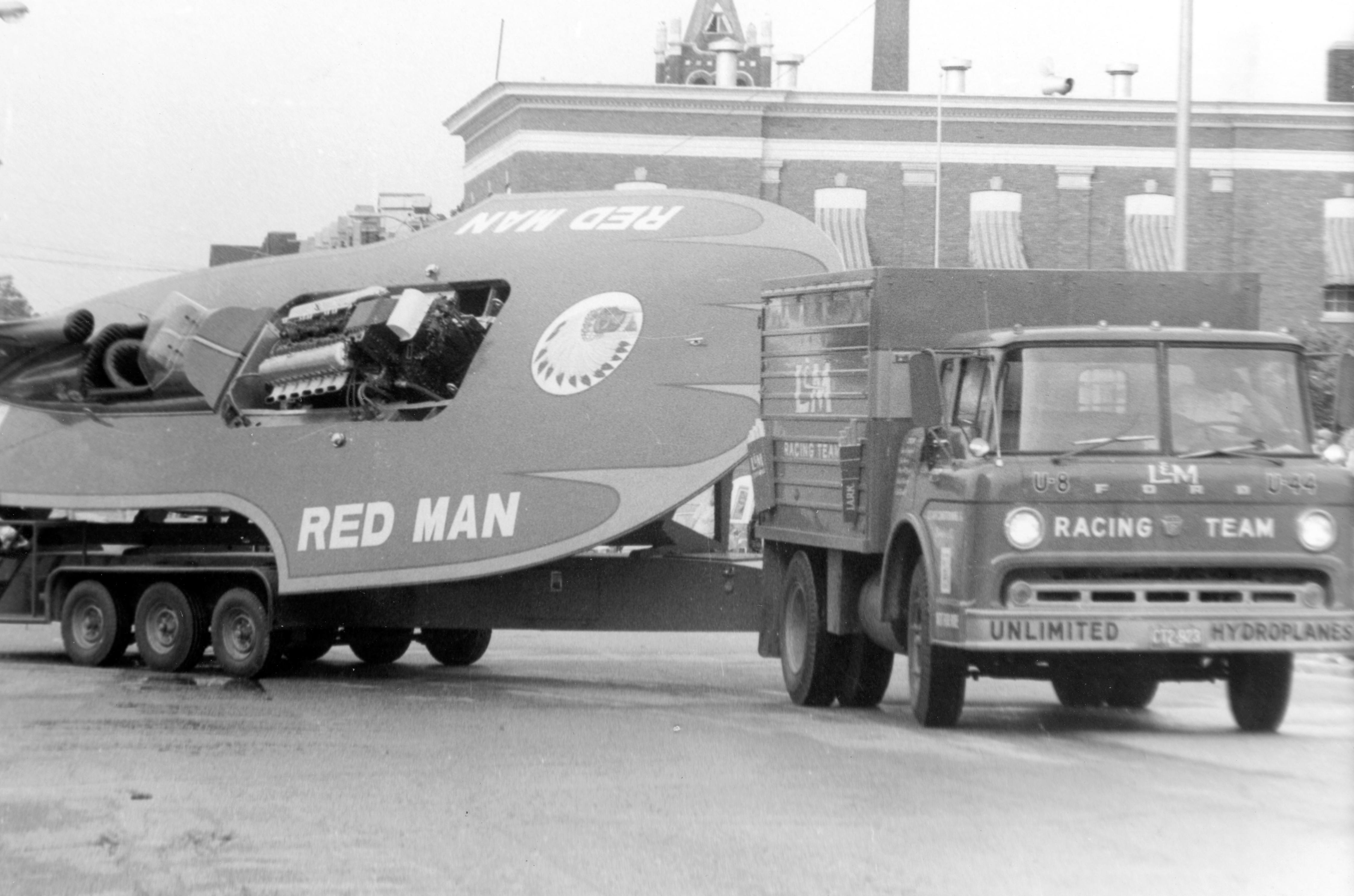 LEM racing team truck pulls hauling the Red Man U-8 hydroplane. From 1979-2009 Evansville hosted Thunder on the Ohio, a race in the Unlimited Hydroplane circuit.