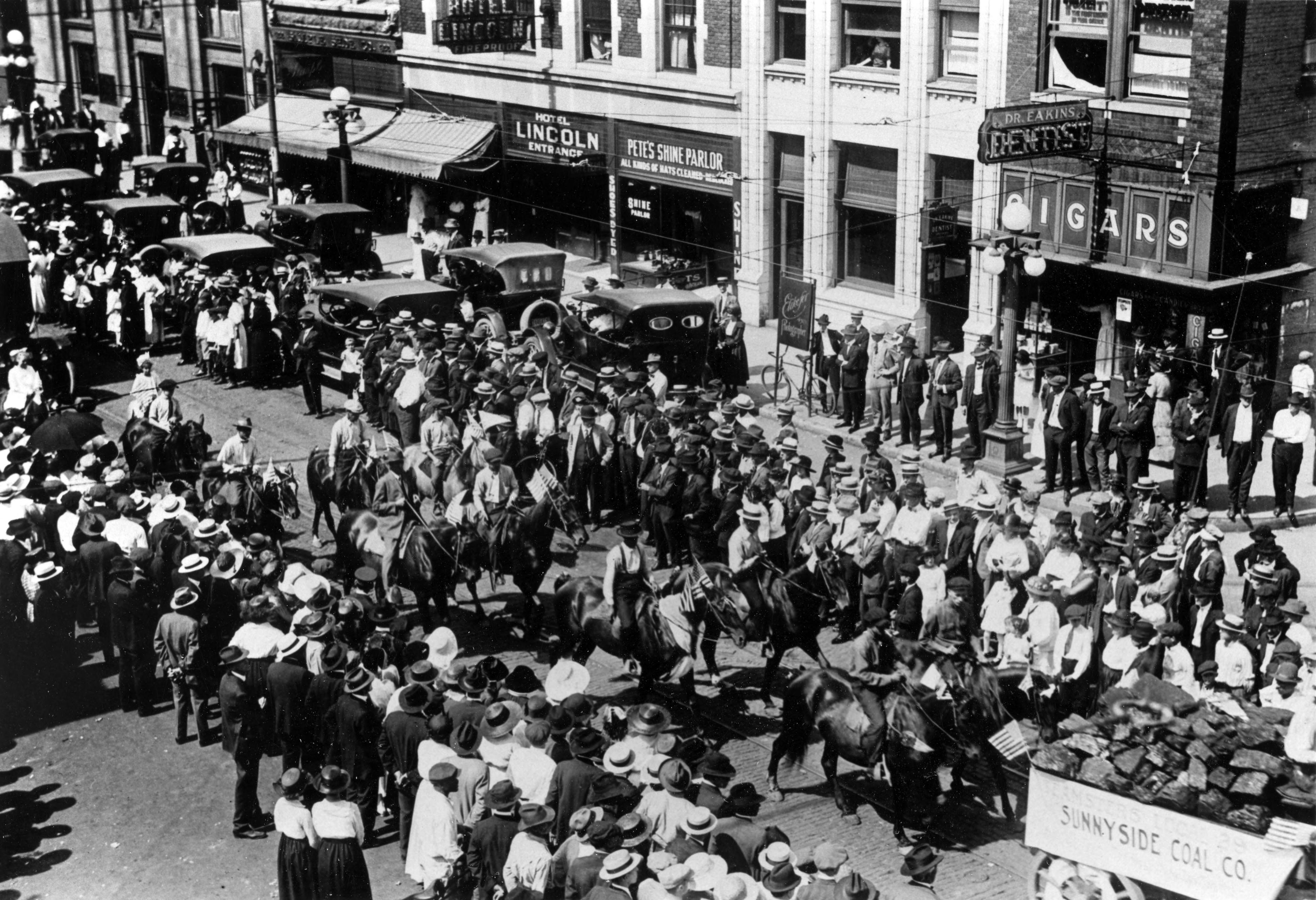 Labor Day parade on Main St., with Teamsters Local 29 from the Sunnyside Coal Co. (The mine itself was on W. Maryland St. near 12th Ave.) Behind them is the Hotel Lincoln at 424-8 Main St., Petes Shine Parlor, and Dr. Edward Eakins dental office above a cigar store, on the corner of 5th St. None of these buildings still stand. Photograph from the Evansville Courier.