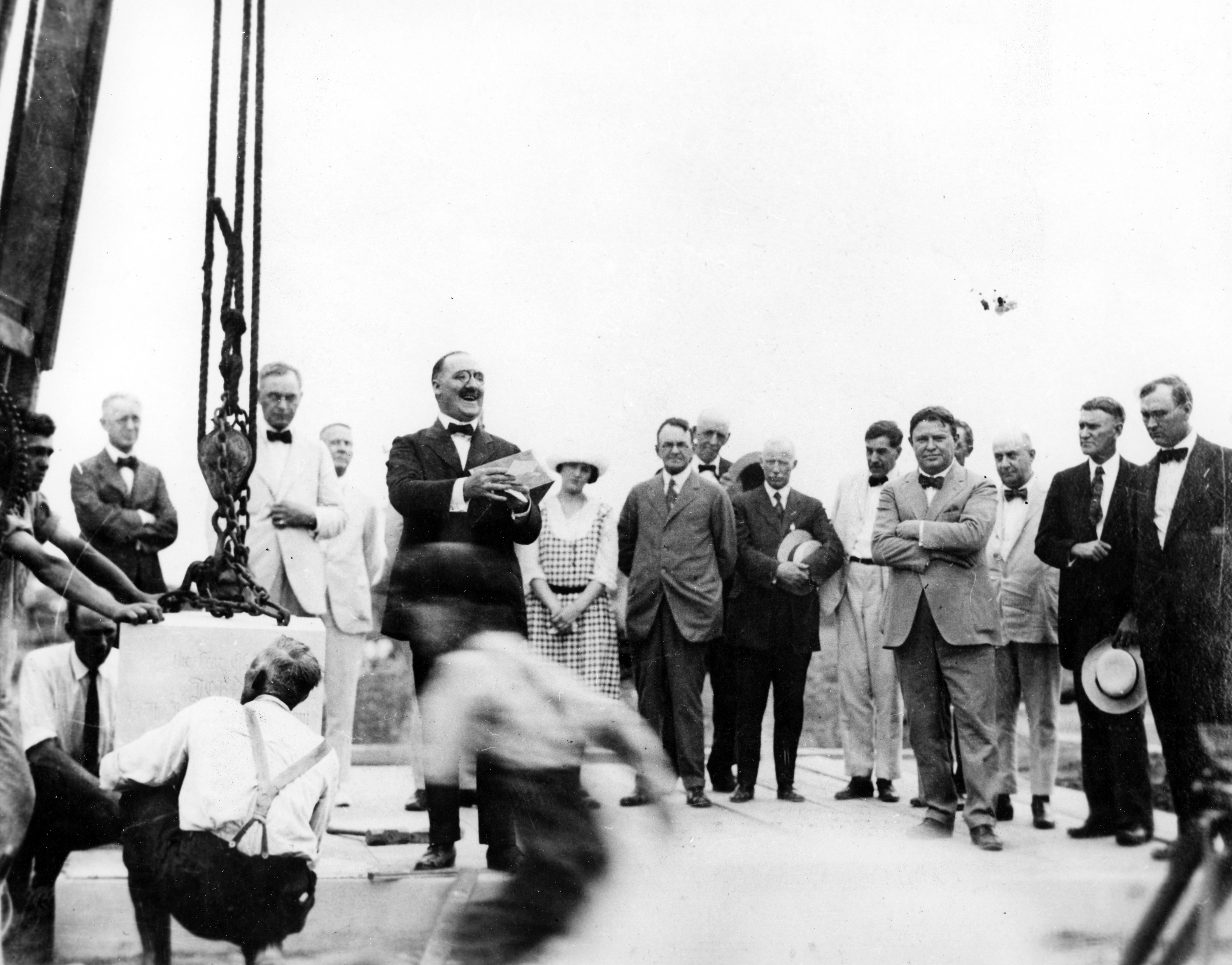 (L-R) George Sonntag Clifford (1858-1927),father, of Evansville College, Alfred Ewin Craig (1861-1928)--president of interracial commission, John J. Nolan (1860-1937), mayor of Evansville 1910-1914), John S. Ward (holding box), Mrs. Helen B. Wolfin (1st graduate after college moved), James V. Stinson, George Tarbok, L.C. Bentley, Walton Mark Wheeler, Sr. (1864-1951), college Board of Trustees, Benjamin Bosse (1874-1922), mayor of Evansville 1914-1922 , Silas Ichenhauser (1863-1936). President of large glassware firm Ichenhauser Co., Edward Robertson, Dr. Alfred F. Hughes (1882-1962), first college president, 1917-1927. This was a ceramony dedicating a cornerstone to a new building on the Evansville College campus. This event was held during commencement ceremonies for the first graduating class in the new location.