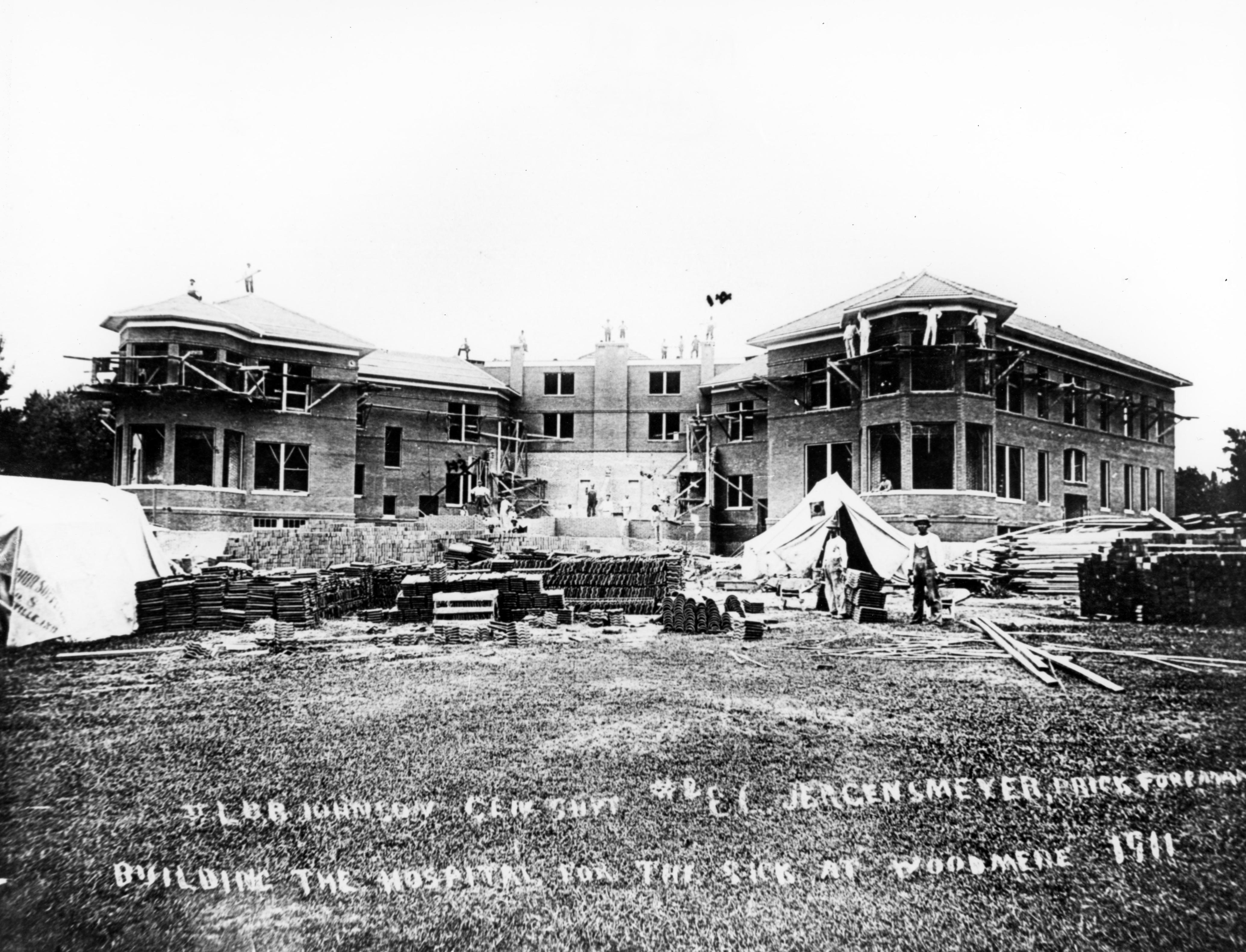 Construction of Woodmere Hospital at 3400 Lincoln Ave., originally Newburgh Rd. (3 miles from the city, at that time). In 1883, the Indiana General Assembly authorized the construction of the Southern Indiana Hospital for the Insane. The hospital was built on 160 acres of land on Newburgh Road, now known as Lincoln Ave., between Evansville and Newburgh. The hospital saw its first patients admitted in October 1890. The campus quickly expanded, eventually holding nearly 900 acres of what is now the East Side of Evansville, including the land eventually repurposed for Robert Stadium, St. Marys Medical Center and Wesselman Woods Nature Preserve. Using patient labor, the hospital staffed a working farm, including dairy cows, poultry and an orchard. Due to stigma, early staff unofficially took to calling the facility Woodmere, meaning tranquility in the forest. In 1927, the General Assembly officially changed the name to the Evansville State Hospital. On February 9, 1943, a fire set by an attendant destroyed much of the original building, leaving at least two staff members dead and six patients missing. In the 1950s, improvements in treatment rendered so much space unnecessary, so much of the land was sold off. A modern facility was built and in 2006, all other buildings were razed. Today the remaining land, still substantial, is used for recreational purposes by the general public. The 1911 date of this photograph indicates an expansion of the facility in that year.