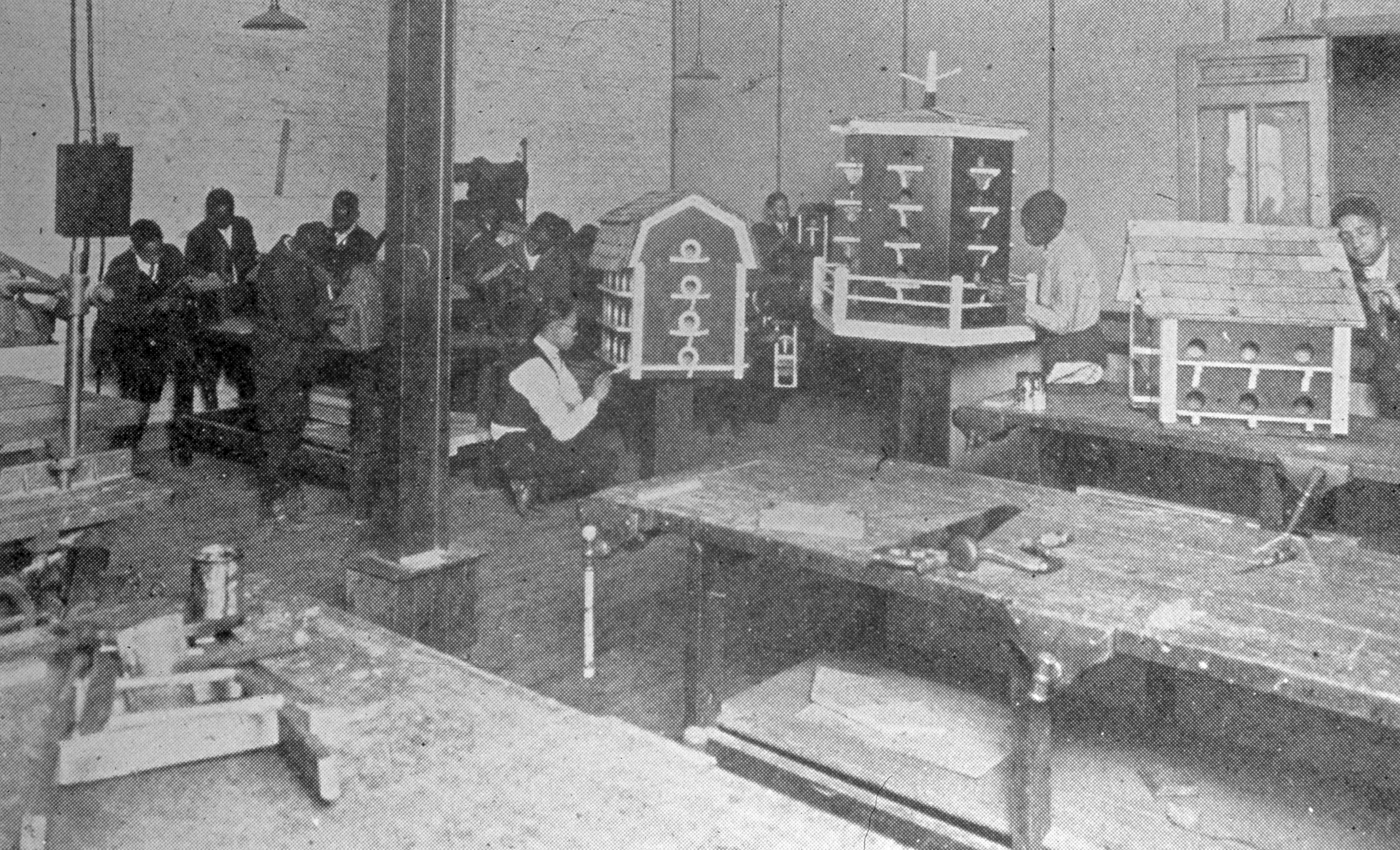 Young African Americans building birdhouses at the manual training school associated with Clark Street School at 215 Clark St. Clark was built in 1869, with a new building 20 years later. In 1919 it was renamed Frederick Douglass High School. In 1928 a new building was built at 635 Lincoln Ave. and renamed Lincoln School. Lincoln still still stands, but Clark was razed circa 1937.