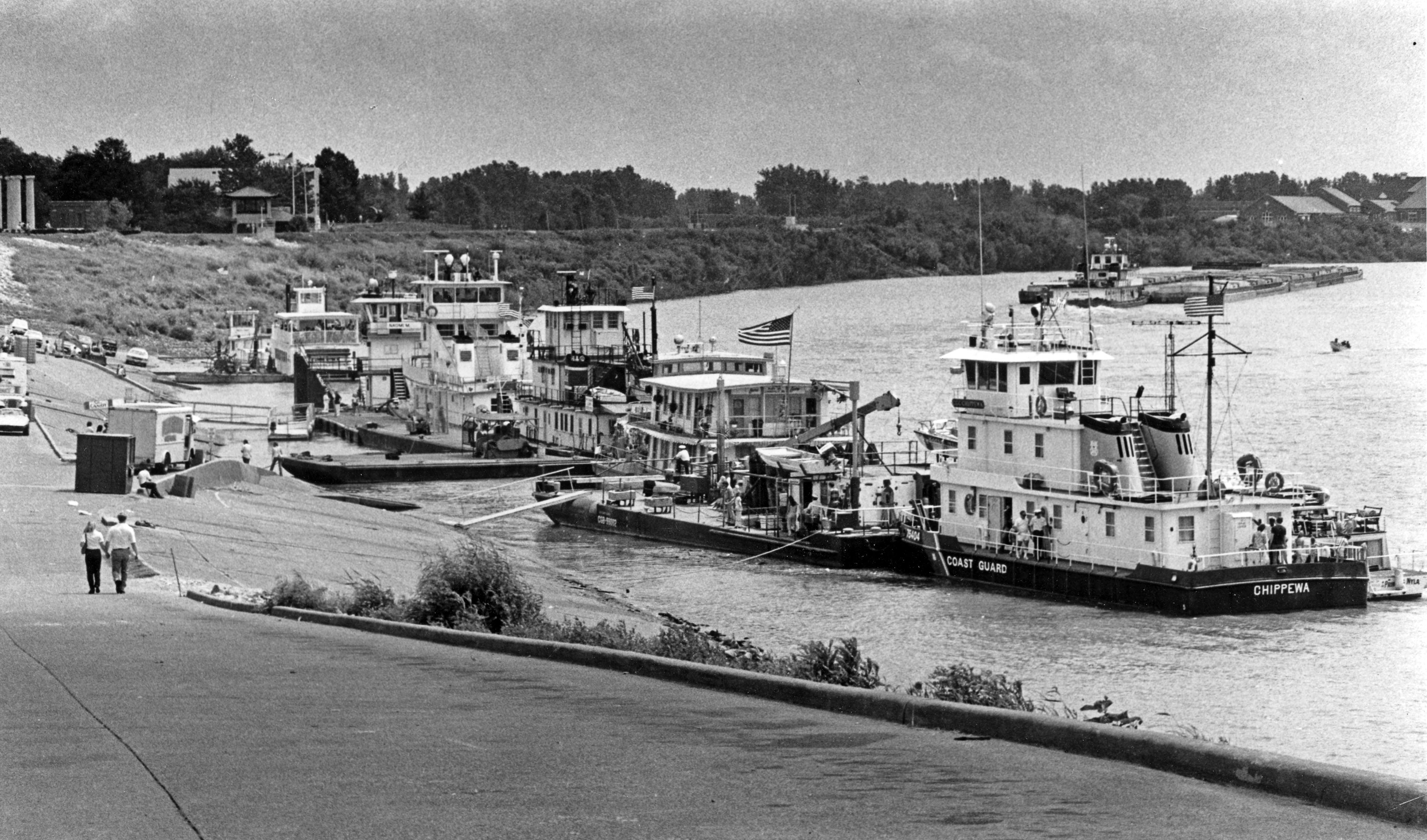 Tugboats and paddlewheelers docked at Dress Plaza, with a barge on the river. The Coast Guard boat the Chippewa is in front. Dress Plaza was built in 1936, and at least partially rebuilt after the 1937 flood. It honors William H. Dress, who was mayor 1935-1943, 1948-1949. Today this area has additional seating. Background left is the Four Freedoms Monument at 267 SE Riverside Dr. Evansvilles most recognizable landmark, the Four Freedoms Monument, is a numerical testament to the United States' most treasured freedoms. Thirteen concentric steps, representing the original 13 colonies, lead to four columns, which are surrounded by 50 pedestals that each bear the name and seal of one state from the Union. The limestone columns, which were originally built in 1882 to adorn the entrance of the C&EI Railroad Depot in Evansville were salvaged in 1961 at the Depots demolition and given a new purpose 15 years later. The Four Freedoms Monument was erected in 1976 in celebration of the U.S. Bicentennial. Four smooth-shafted, ionic columns act as 26-foot tall evocative reminders of: the freedom of speech, freedom from oppression, freedom of religion and freedom from fear. Some also suggest the circular base on which these four columns sit symbolizes a fifth freedom, the freedom to peacefully assemble, which many groups do at this site regularly. Also visible is the pagoda that is near the Evansville Museum. Built in 1912 and restored in 1995, the Pagoda retains its original Japanese architectural design conceived from a model displayed at the Worlds Columbian Exposition in Chicago in 1893. It now serves as the Evansville Visitors Center.