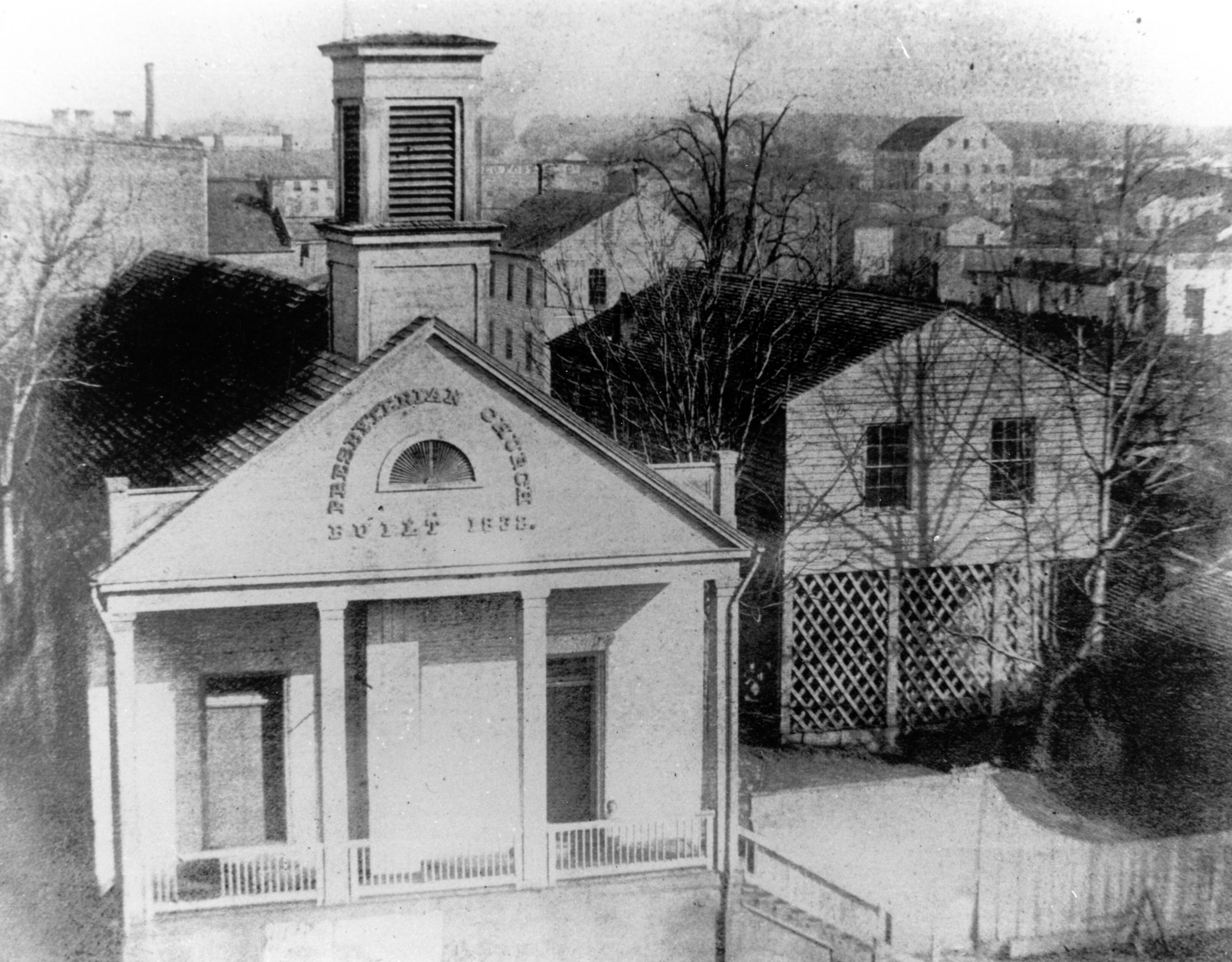 This Presbyterian Church was the first church building in Evansville in 1832. Presbyterians bought a lot in 1831 and erected the church on what used to be a hill. The building that stood on 2nd St near Main St earned the nickname, Little Church on the Hill. (This is the rear view, on 2nd St. and Main St.) In 1837, national theological divisions produced a local schism. Vine St. Presbyterian (later Grace Presbyterian) split off, forming the local old school branch. The new school branch remained at this location. The belfry and bell were added in 1848, and the building underwent repairs. It was sold around 1859 and the proceeds used to build new church. The congregation moved in 1863 to a new location on Walnut St and 2nd St and was aptly renamed Walnut St. Presbyterian. The building was razed in 1884. As the first church building in town, the Little Church on the Hill held services for other denominations for the first 6 years.