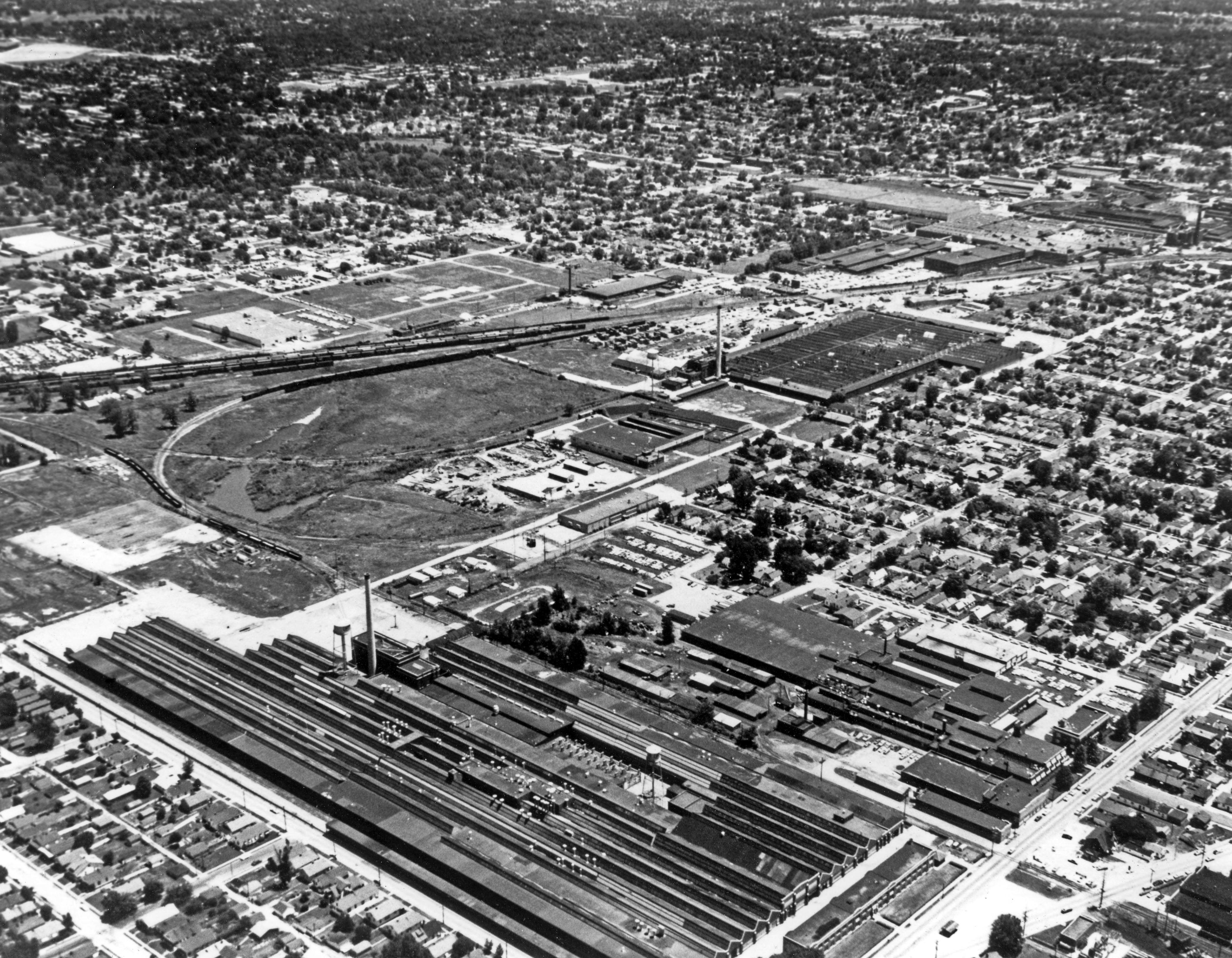 Chrysler plant (foreground) at 1625 N. Garvin St. On this site originally was the Graham Brothers Truck Company (1919), which merged with Dodge in 1925; the Dodge plant was taken over by Chrysler in 1928. Dodges continued to be built until 1932 when operation ceased; it resumed in 1935 and soon thereafter Plymouth production began with the 1936 model cars. A shelter operated out of this location during the 1937 flood. During WWII, Chrysler retooled to produce 96% of all .45 ammunition for all the armed forces. Plymouth produced began again after the war until the plant closed in 1959. Some parts of these buildings remain today. Photograph from the Evansville Press.