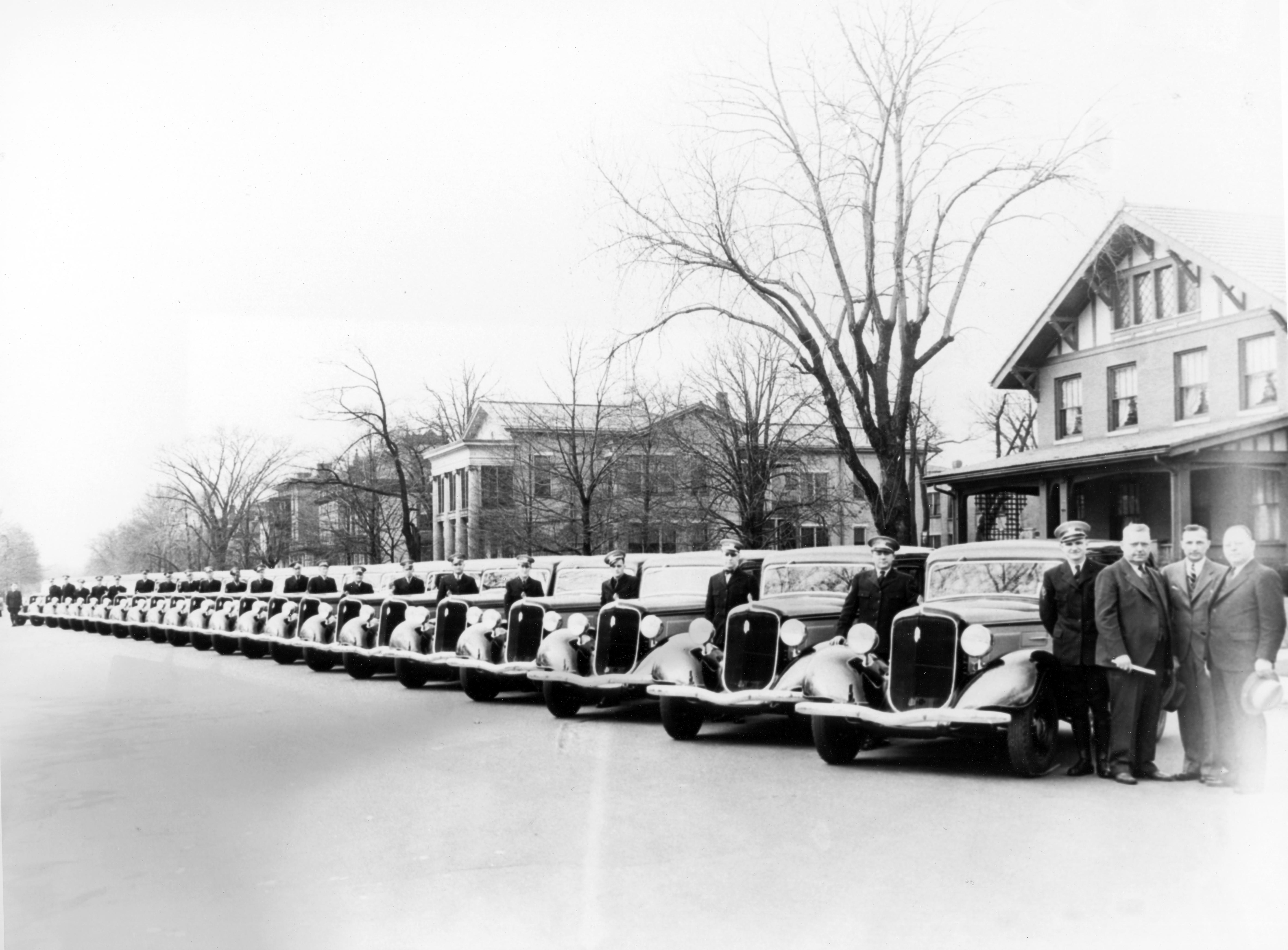 Long line of police cars with officers standing next to them, with 3 unidentified man standing on the right on Riverside Drive.
