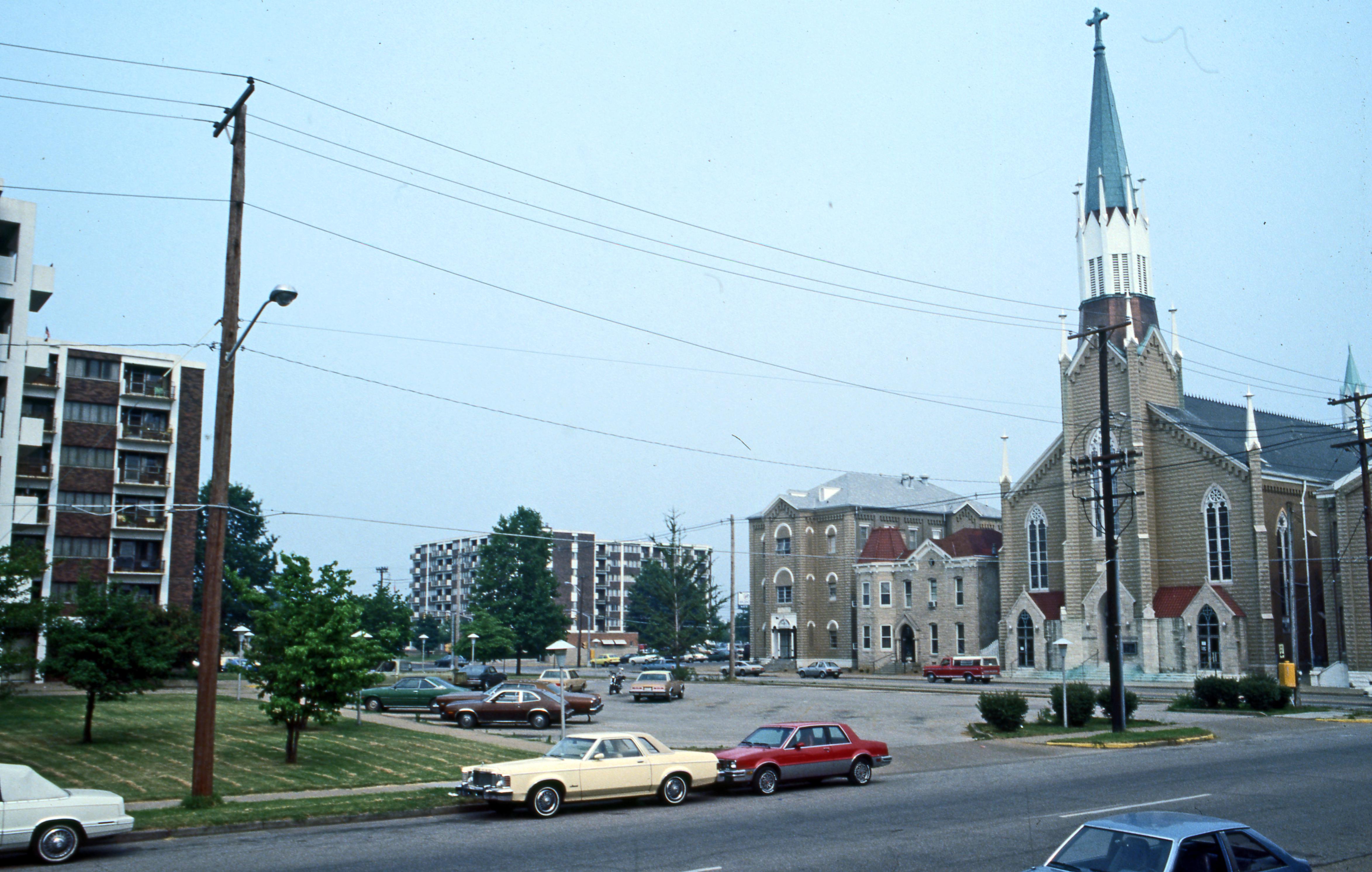 The church and surrounding buildings are St. Mary's Catholic Church at 613 Cherry St. Like a number of communities along the Ohio River, Evansville was growing. The decade between 1860 and 1870 saw the population of the city double from a little over 11,000 people to almost 22,000 people. Of these 22,000, four fifths were either direct German immigrants or had German ancestry. Some belonged to the Evangelical tradition, but most were either Lutheran or Roman Catholic. Between 1834 and 1857, Evansville had only one Catholic Church, Assumption, to serve all Catholics regardless of nationality. It was an English speaking church, generally. In 1857, Holy Trinity became the second Catholic Parish in Evansville, and it was German speaking. While the Mass, most sacraments, and even Benediction were conducted in Latin, certain other aspects of spiritual life were conducted in the language of the people. Preaching, the Sacrament of Reconciliation, wedding vows and most popular devotional activities were conducted in the vernacular. Holy Trinity was the only German speaking church between St. Philip in Posey County on the west, and Rockport in Spencer County on the east. Soon Trinity too was bulging at the seams. In 1866, James Maurice de St. Palais, bishop of the Vincennes Diocese, recognized the need for another German speaking Catholic church in Evansville, and appointed the Reverend Johannes (John) Viefhaus, assistant pastor at Holy Trinity, to found it and serve as pastor. Fr. Viefhaus purchased five lots in the old eastern subdivision which had been platted by Robert Evans and John Shanklin in 1839 and erected a brick school building at the corner of Upper 6th and Cherry Streets. This two-story brick building cost $5,000.00 The siting of the parish facilities was important, because the new parish boundaries would stretch from Main Street in Evansville all the way to the Warrick County line on the east. The immediate area surrounding the new church ground was already densely residential on the standard average 25 foot wide lots. There were lots of people to take care of. Plans began immediately for the erection of a large brick church. Ludwig Reidinger of Lawrenceburg, Indiana, was the architect and Bishop St. Palais laid the cornerstone on 28 October 1866. The church was placed under the patronage of St. Mary of the Immaculate Conception. Holy Eucharist was first celebrated in the church on 23 December 1867 and the building was dedicated on 1 January 1868. The cost of the building and its furnishings, including altars, pews, bells and organ, was $60,000.00. In use daily, this worship space remains now as the oldest standing Catholic church within the city of Evansville. In 1871, the Franciscan sisters of Oldenburg, Indiana erected a second brick school building on the property. This three-story facility provided school rooms for female students and housed the sisters residence. The older school building, in true Germanic custom, was allocated for the education of the male students. By 1880, there were approximately 400 students at St. Mary School taught by four Franciscan sisters and one lay teacher, Professor Steinhauser, who did double duty as principal. The Parish House, a two story edifice, also of brick, was erected adjacent to the church in 1881, to house the pastor and new assistant. After 26 years as pastor, Father Viefhaus resigned in 1892. He retired to a Carthusian monastery in Germany where he died in 1916. Over the next 50 years, many changes and upgrades were added to the parish plant. The facades of the buildings received a faux stone veneer called sham-rock about 1900, and the other exterior walls were coated with a stucco. The chancel of the church received its initial marble floor around 1916 and a new Estey Pipe Organ was installed in the loft in 1918. This instrument cost $9,300.00. During this era also, a steam heat boiler and electricity were introduced. A fire in 1937, probably the result of faulty wiring, caused significant smoke and water damage, but overall structural damage was minimal. The cost to repair and renovate the church in that depression time was $33,000.00. Records from that period tell us that the Chancel was expanded somewhat and more marble flooring added, that the choir loft was cut back some 20 feet, and that decorative capitals were added to the ribbed columns that form the nave. The stained glass window in the ceiling of the apse is thought by some to have been added at the same time. The 1937 flood did not reach into the buildings, but did puddle on Cherry Street directly in front of the facilities. New windows, by Frei Studios of St. Louis, were installed in 1941, and a new Wicks pipe organ the following year. In 1940, a new suite of rooms, including the tower corner were added to the Parish House, and in 1944, the boys school building was remodeled into a facility with a large dining room, kitchen, club rooms and auditorium. The old boys school is now named Rager Hall after Reverend John C. Rager who served the parish for 26 years as pastor. The 1950s saw the installation of the Terrazzo floor in the church and the Bedford stone vestibule additions to the front church. The church became the first Catholic church within the city of Evansville to be air-conditioned in 1962, with the AC units placed in the choir loft. Because of substantially declining enrollments, the grade school closed in 1973. The building was remodeled in 1996 to provide administrative offices, meeting rooms, Christian education space, a chapel, a library and a food pantry. It is now called the Ministry Center. By the 1980s, Evansville's downtown area had seen residential flight to the suburbs. The fabric of the church building was showing its age with crumbling plaster and peeling paint; the steeple was leaning; there were no immediate rest room facilities, wiring posed a huge risk, and the changes in Catholic liturgy demanded more than a stop-gap fix. A capital campaign to 