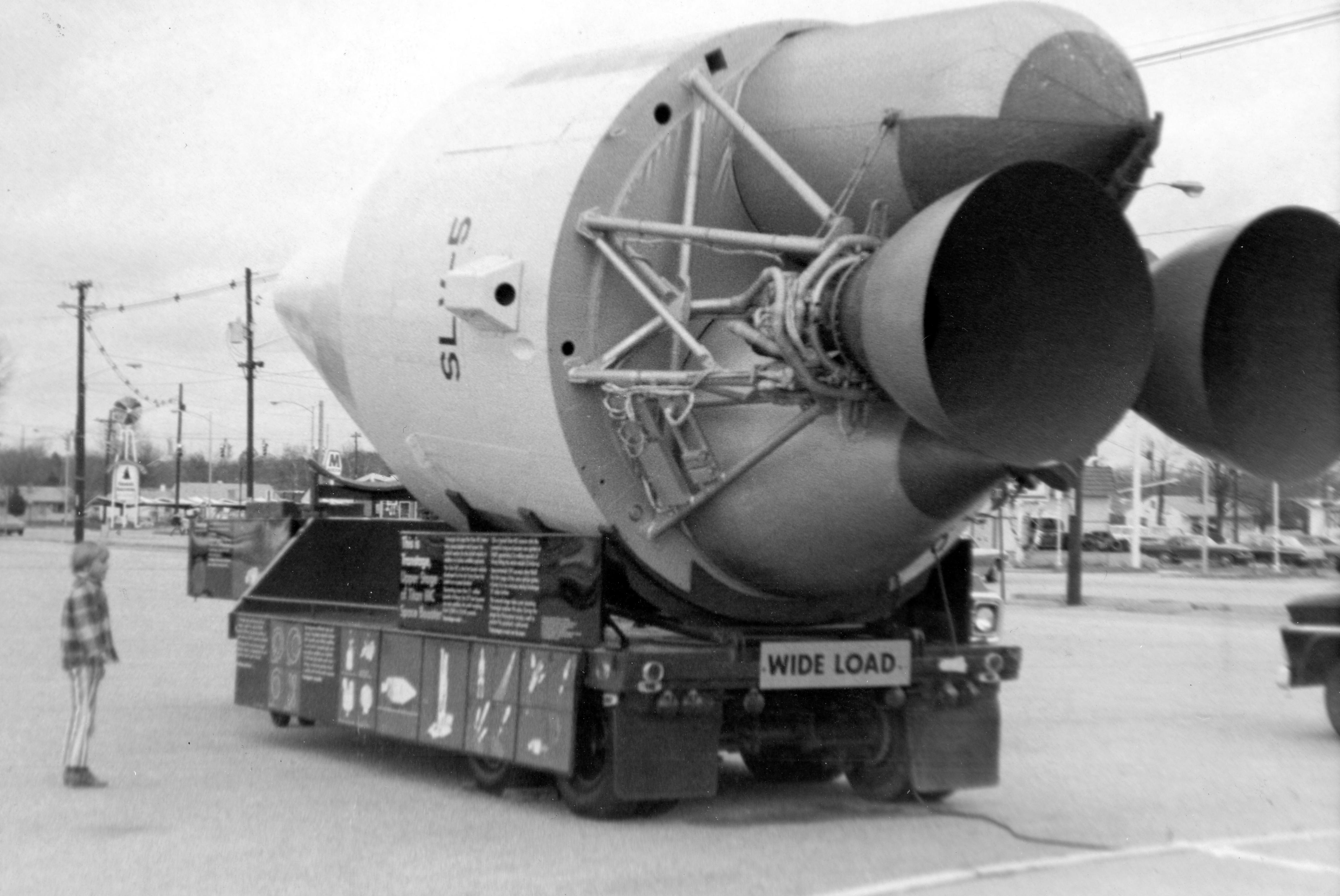 Child observes SLV-5 rocket. It was located near the Citizens National Bank, North Park Branch, probably on or near First Ave. Vanguard SLV-5, also called Vanguard Satellite Launch Vehicle-Five hoped to be the third successful flight of the American Vanguard rocket following the successful Vanguard 2 satellite on rocket Vanguard SLV-4. Vanguard SLV-5 launched on 14 April 1959 at 02:49 GMT, from Launch Complex 18A at the Cape Canaveral Air Force Station. A momentary delay in first stage separation caused the second stage engine to ignite while still attached to the first stage. Pressure from the engine exhaust pushed the thrust chamber to the limit of the gimbal stops, breaking them and causing loss of attitude control in flight. The second stage tumbled and the resultant forces caused a premature separation of the third stage and payload. Data was received from them until impact in the Atlantic Ocean eight minutes after liftoff. Vanguard SLV-5 hoped to put into orbit two satellites: the Vanguard 3A satellite, a magnetometer, and a 76 cm (30 in) round inflatable sphere with an air density measurement device. Vanguard SLV-5 only reached an altitude of 100 km (62 mi), the goal was 3,840 km (2,390 mi) to orbit. Looking at the words on the rocket carrier led to this information from NASA, The Titan Transtage, an upper stage of the Titan III rocket family, arrived at NASAs Johnson Space Center May 26 [2016], where it will be studied by scientists in the Orbital Debris Program Office (ODPO) to obtain information to complete forensics that will help us understand why things break up in space. Developed in the 1960s to lift heavy payloads, or multiple small payloads, to specific locations in low-Earth orbit (LEO) and Geosynchronous Earth Orbit (GEO), the Transtage was the worlds first, space tug, capable of multiple restarts of its engine and could deliver multiple spacecraft to precise orbits in a single mission.