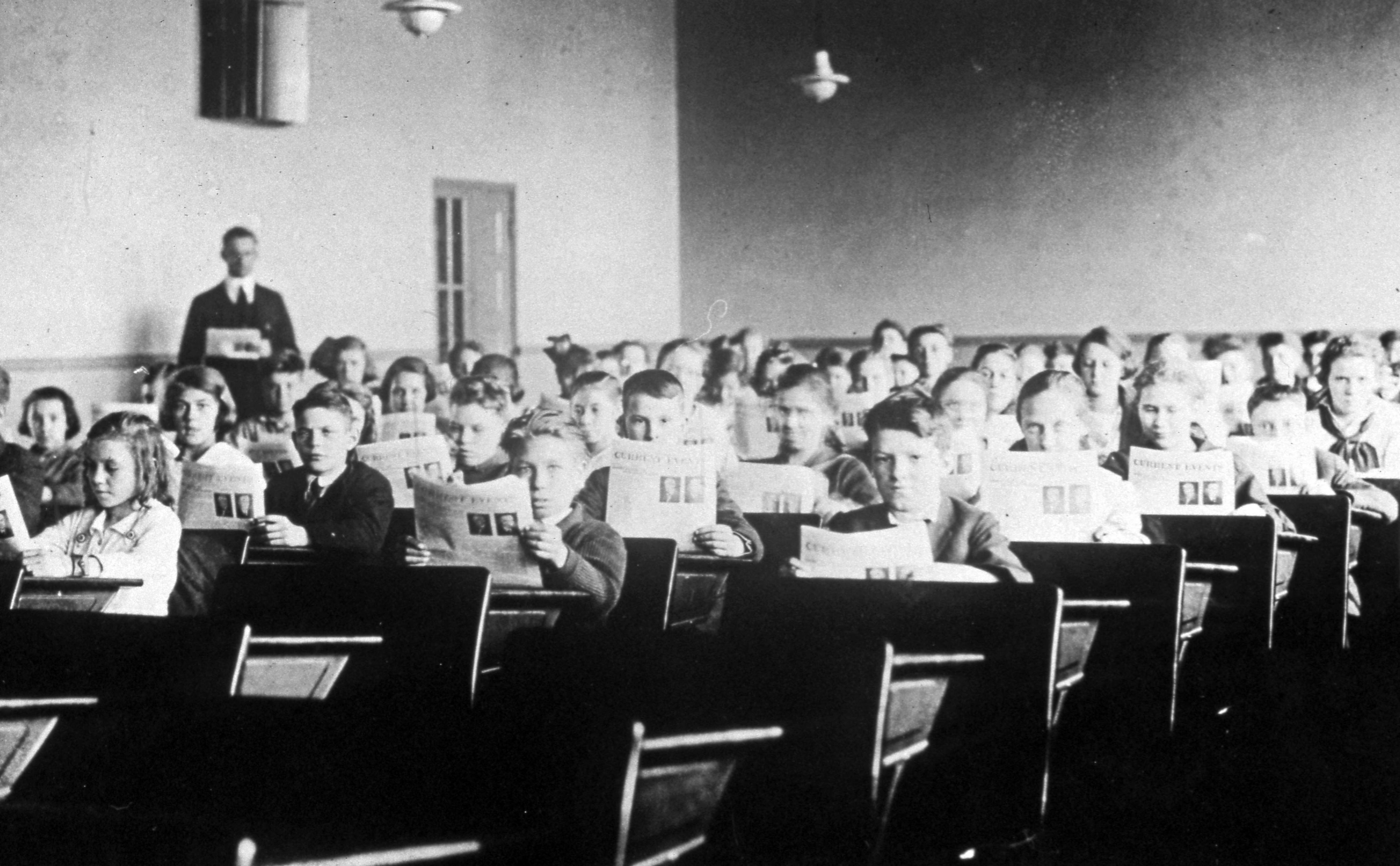 Classroom of possible middle school aged children all reading a newspaper that says Current Events in the headline. The teacher stands along the wall.