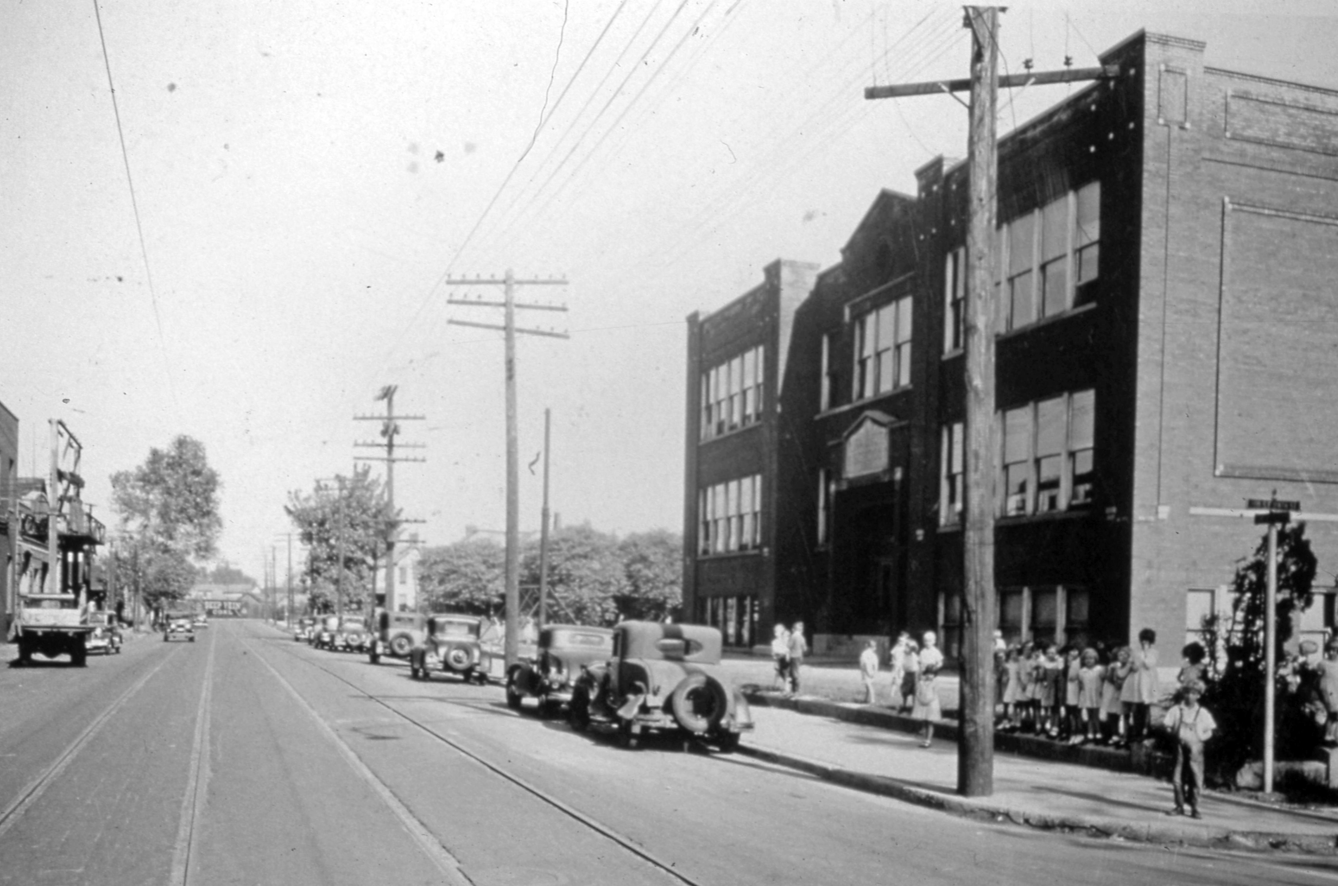 Corner of Walnut St. and 9th St. On the right is Walnut School at 910 Chestnut St.-216 SE 9th St. This building, facing Walnut St., dates to 1913, although there were earlier buildings facing 9th St. (1867) and Chestnut St. (1894). The school was variously known as one of these names or some combination over the years. The original 9th St. school was torn down to build this one. At some time during its existence this was a colored school. This building was razed around 1981, and in 2009 any remaining buildings were also razed. The Centre (entertainment venue) now stands at this location. At the very end of the street (middle background) can be seen a sign for Deep Vein Coal Co., which was located at 100 E. Walnut St.