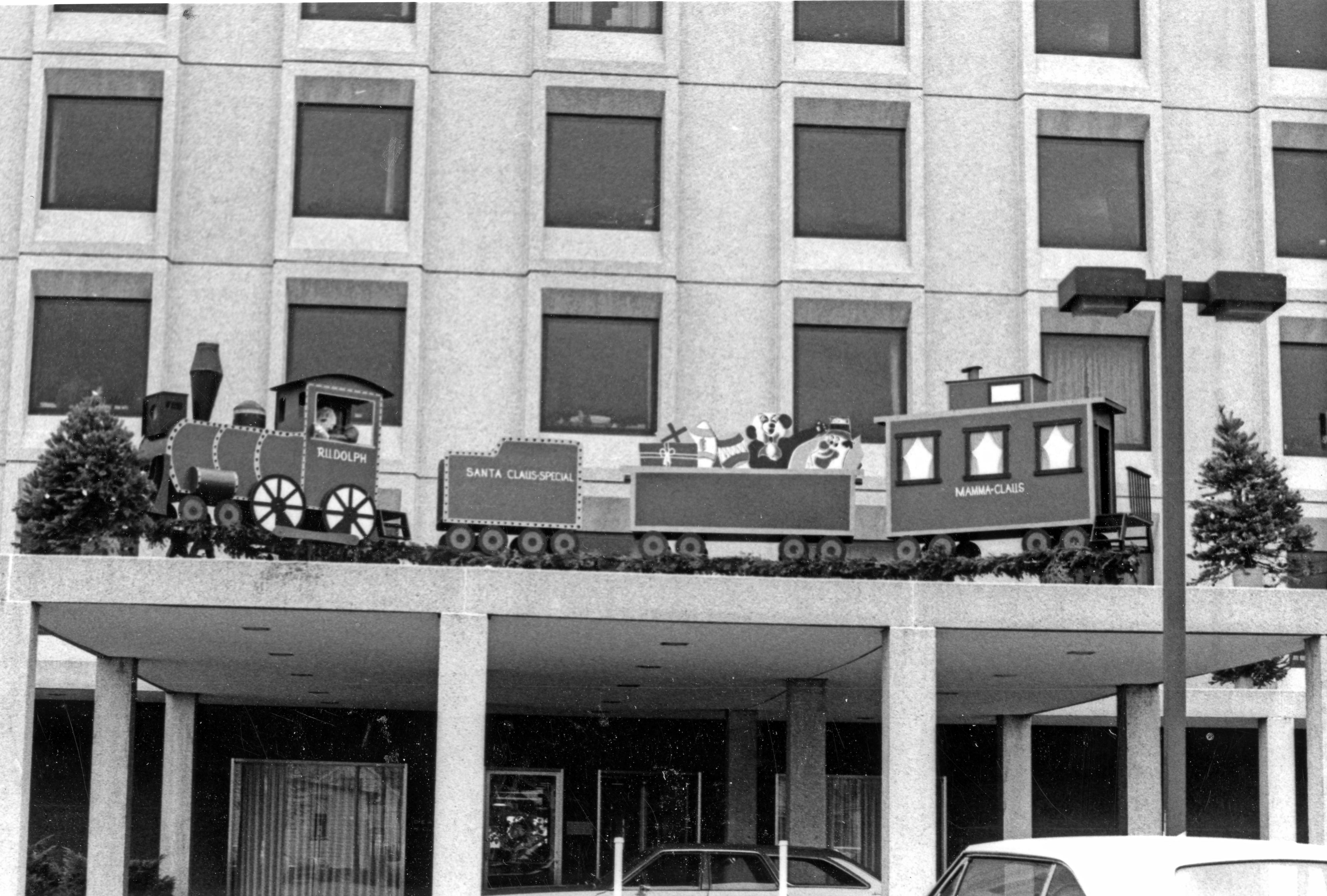Christmas toy train over the main entrance to Deaconess Hospital at 600 Mary St.