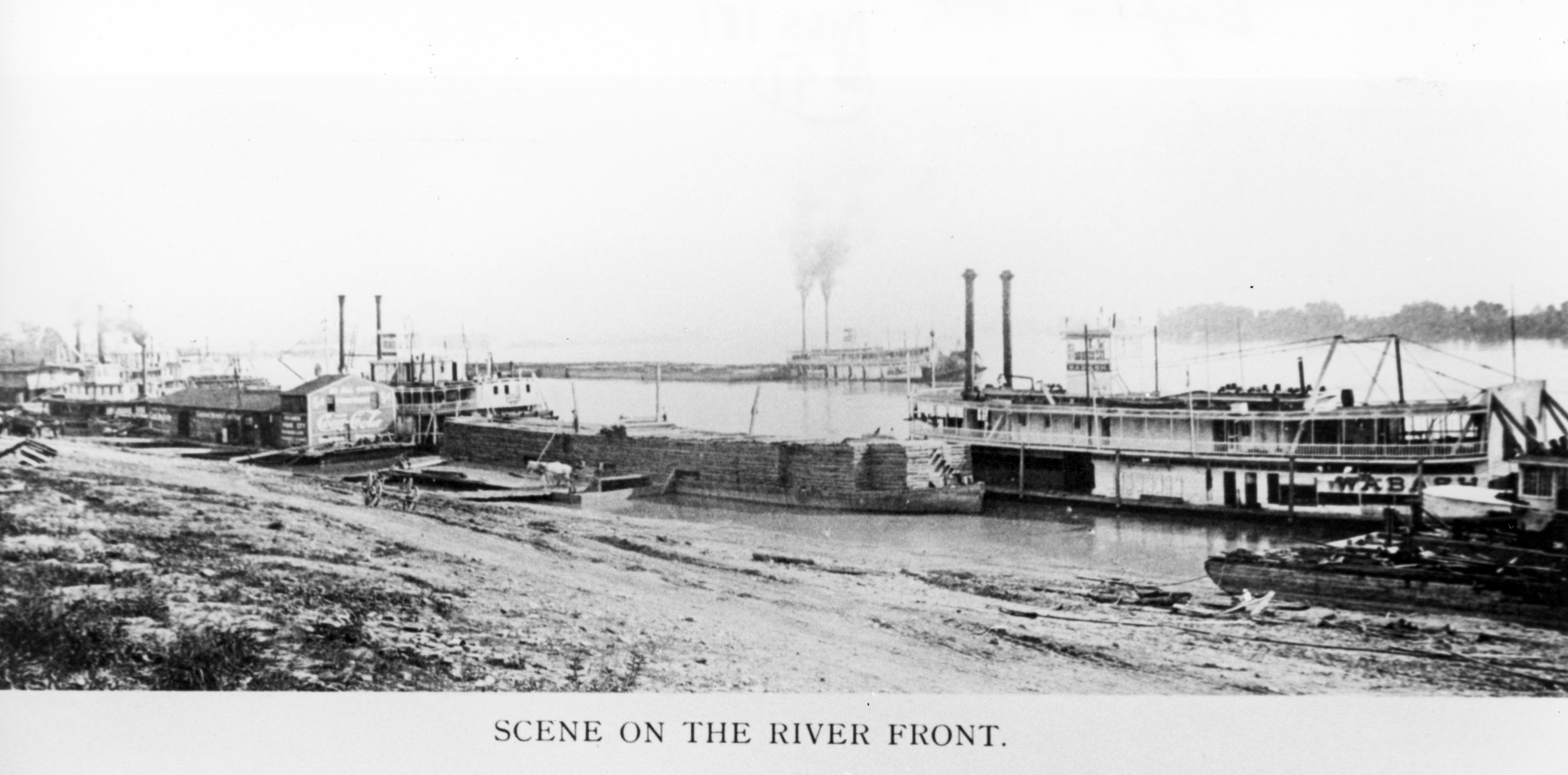 Multiple boats and barges\, in addition to the wharf boat, at the Evansville waterfront. Traffic on the river was vital to commerce. This area was paved and moderned in 1936 and is called Dress Plaza.