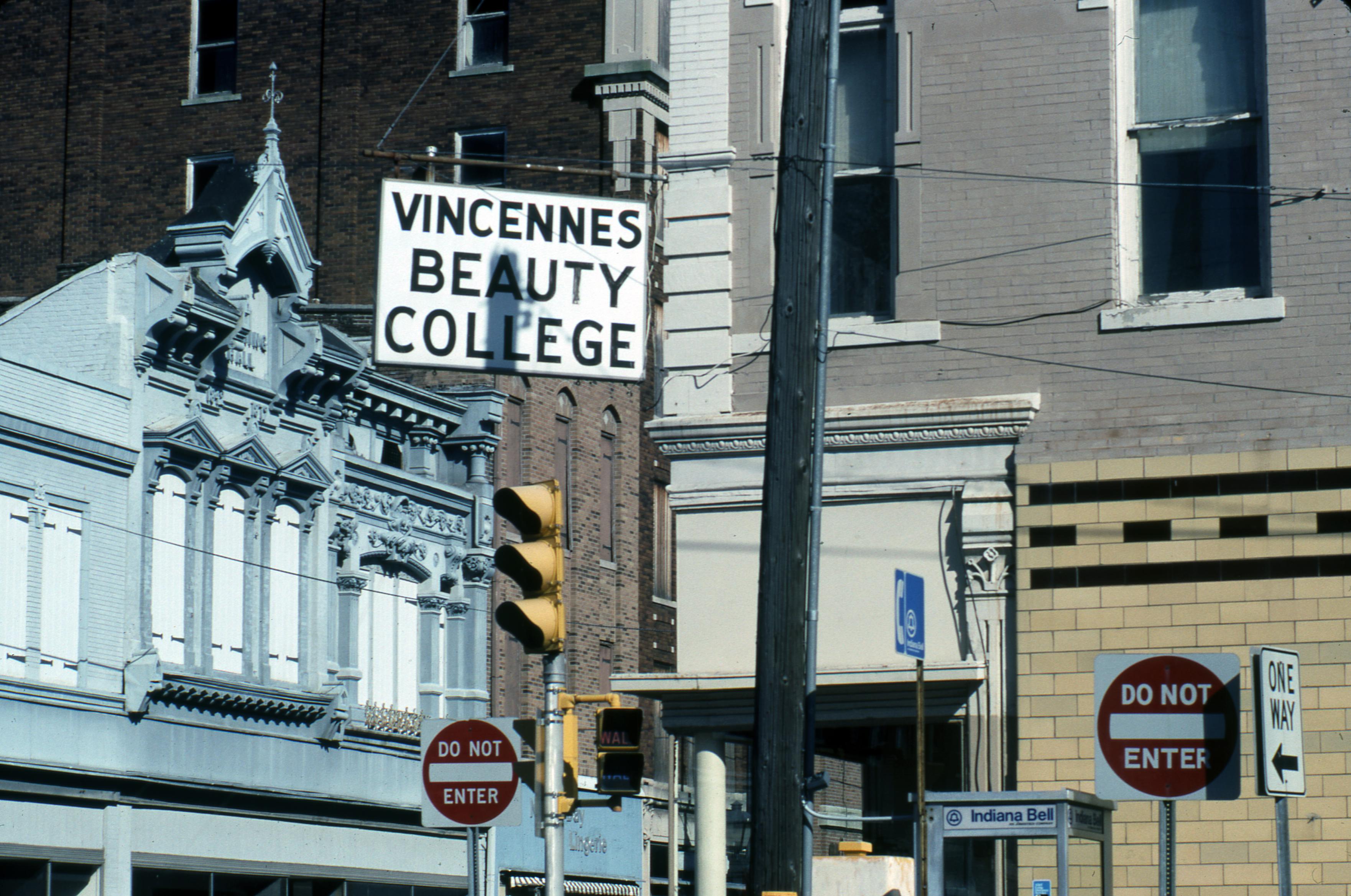 Vincennes Beauty College at 12 S. 2nd St., on the corner with Main St. It has been in operation since 1963. Across the street is Clothing Hall-see MSS 124-417.
