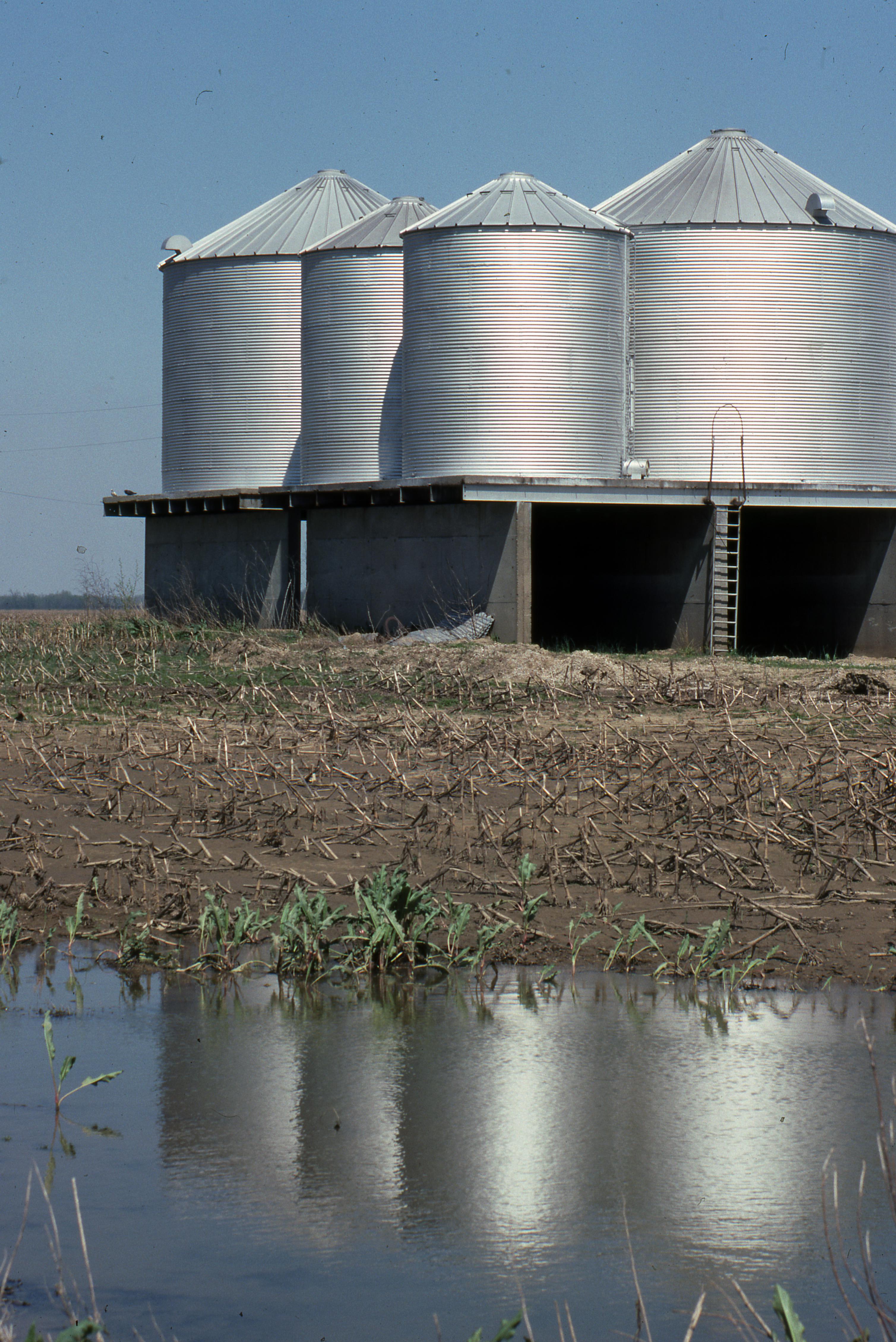 Storage bins or silos in Union Township Dogtown area. Union Township is the southwestern most township in Vanderburgh County and is very sparsely populated because it lies within the Ohio River floodplain. A map of the townships shows this one looking like a balloon hanging into the Ohio River. Dogtown comes from the name of a popular tavern (began sometime after 1915) located here, housed in what was an 1889 Cypress Post Office and Saloon. The tavern is no longer in business.