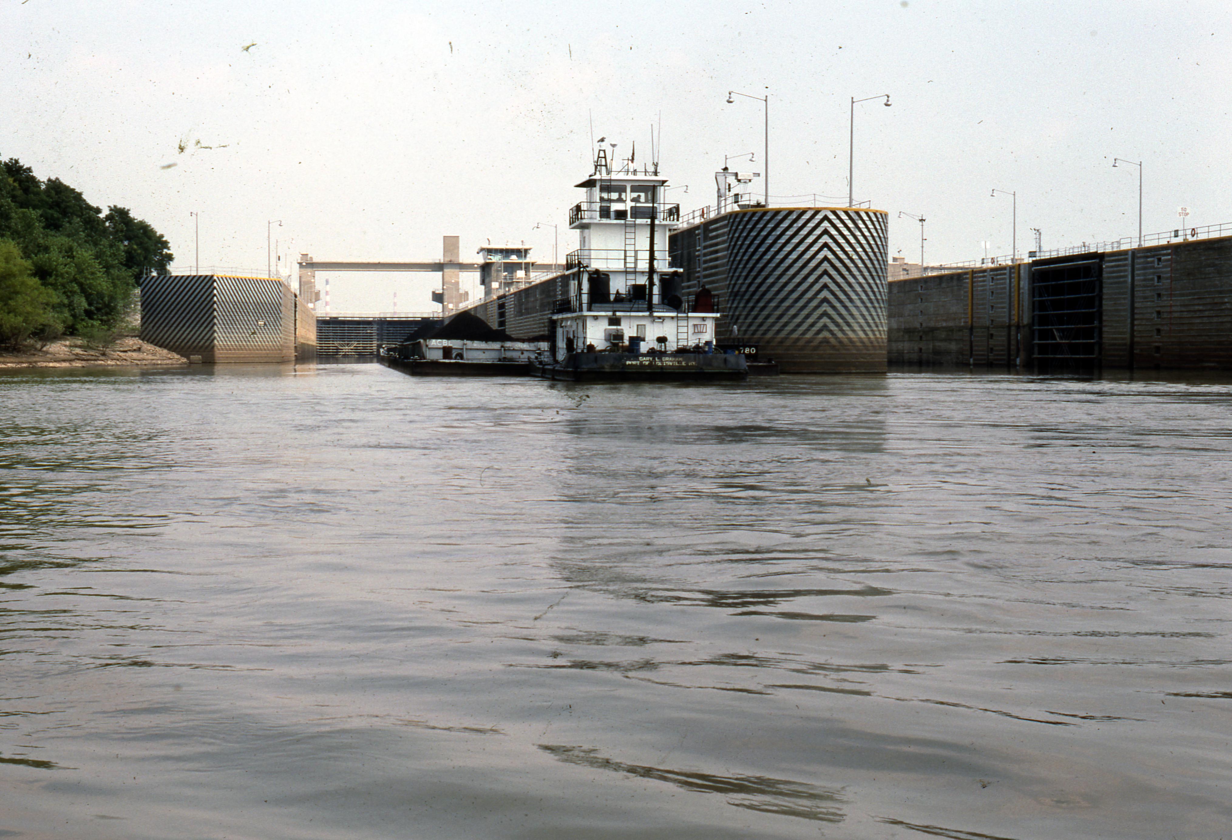 Gary L. Graham tugboat from the port of Louisville, KY locking through at Newburgh. This tow was built in 1981 in Clarksville, IN and is currently named the Kevin E. Turner. The Newburgh Locks and Dam is located on the Ohio River near Newburgh, Indiana, at mile 776.1 below Pittsburgh, Pennsylvania. It is about 16 miles upstream from Evansville, Indiana. The Navigation locks are located on the right descending bank or Indiana side of the river. The upper pool maintained above the dam extends upstream for a distance of 55.4 miles to the Cannelton Locks and Dam at mile 720.7. Newburgh Locks and Dam was authorized as a replacement for existing Locks and Dams 46 and 47 on April 24, 1962, by Secretary of the Army under authority of Section 6 of the Rivers and Harbors Act approved March 3, 1909. Newburgh Locks� construction began in June 1966. The locks were placed in operation in December 1969. Dam construction began in June 1970, and was completed in 1975. The most significant change was an addition of a Centralized Control Station on top of the Operations Building in 1980. Lock operators perform a major portion of the lock and dam operations from the Central Control Station.