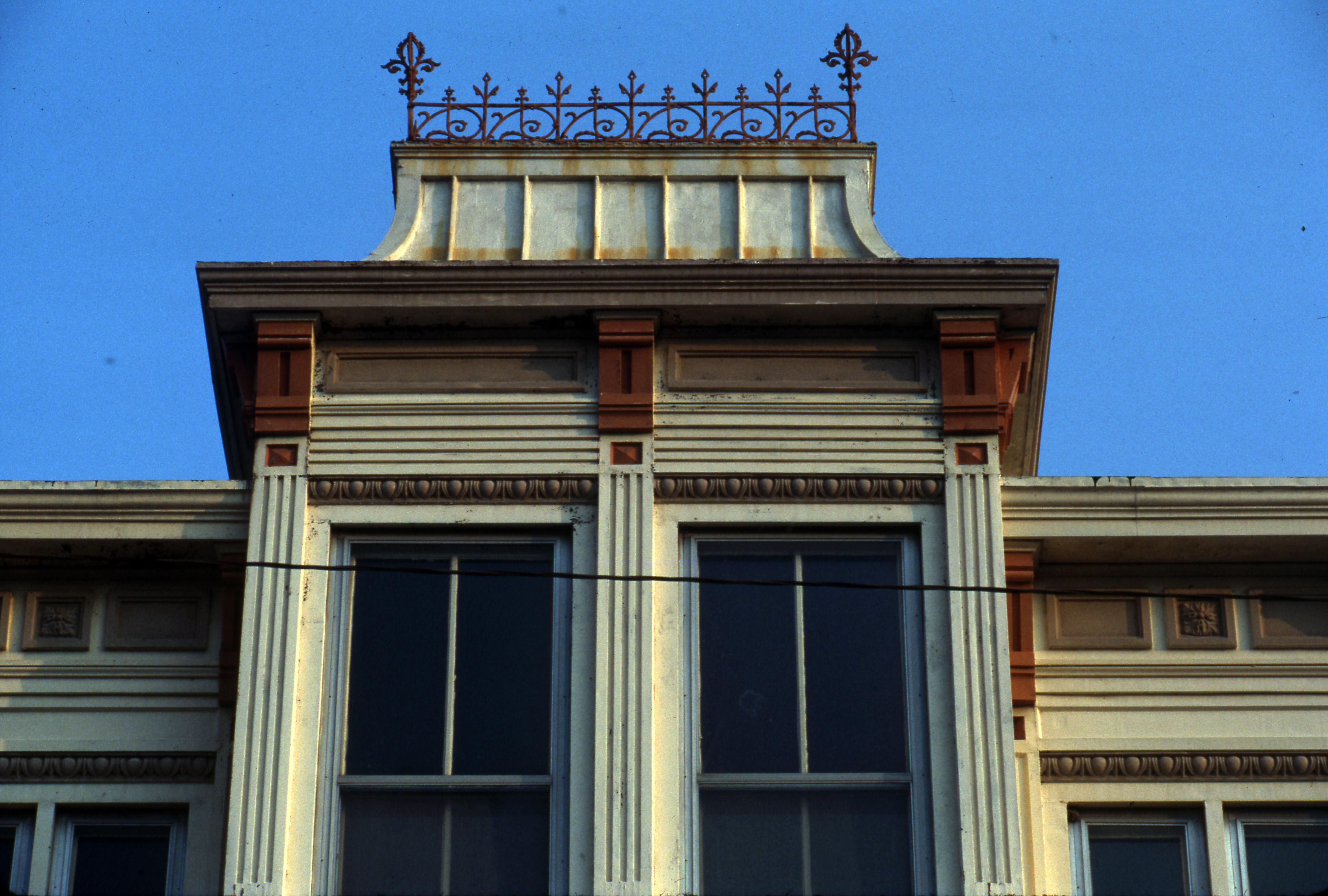 Facade detail of Heldt and Voelker Hardware at 2100 W. Franklin St. This building was built in 1890 for wholesale grocer August Rosenberger, who occupied it until 1925 when Heldt and Voelker hardware moved in. Sometime in the 2000s this was converted to a restaurant, the Gerst Haus, which still operates today. The facade looks much like what is seen here.