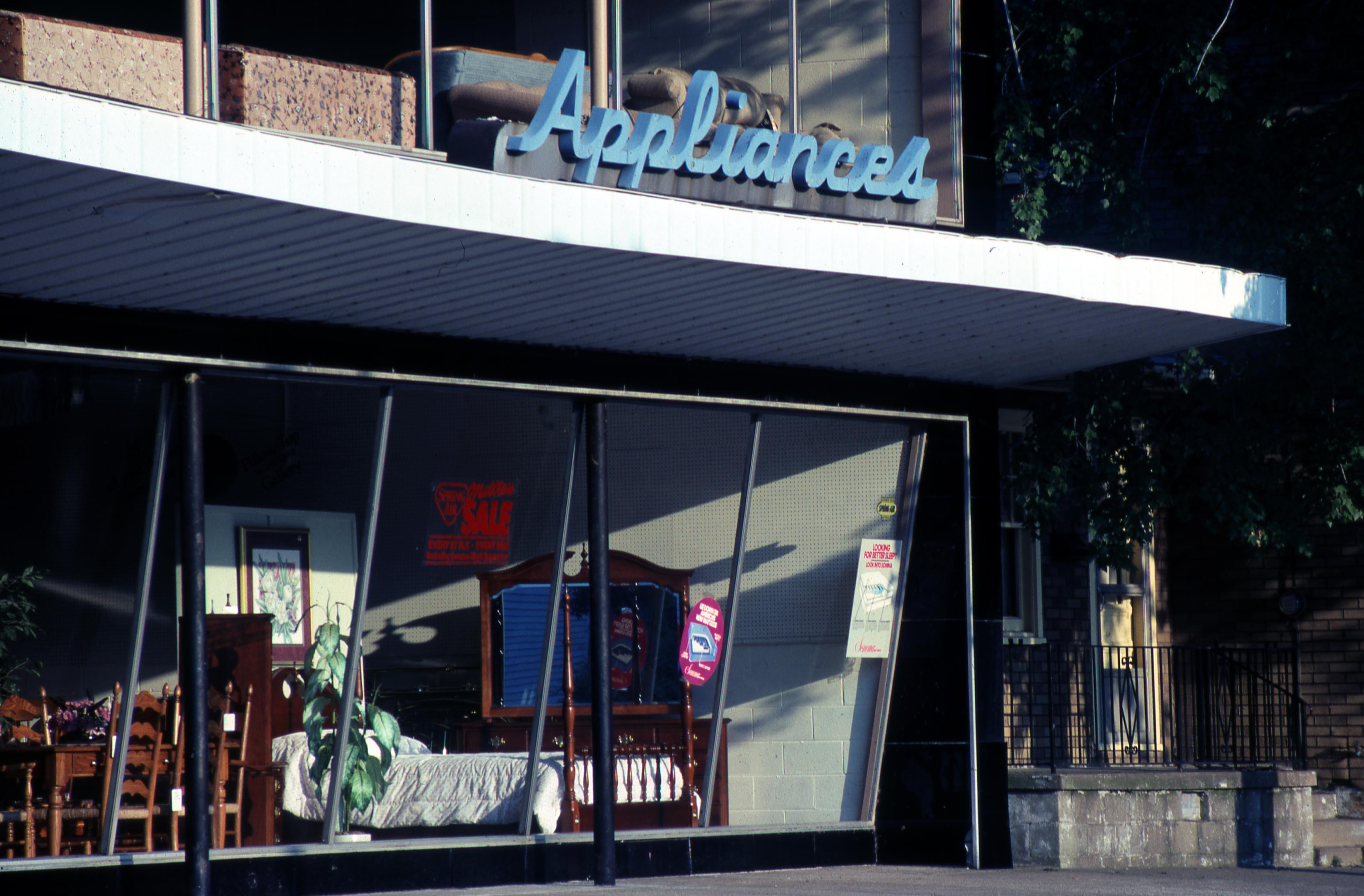 Close up of the right side of the Carpet Loft and Fischers Furniture and Appliance building at 910 Main St.