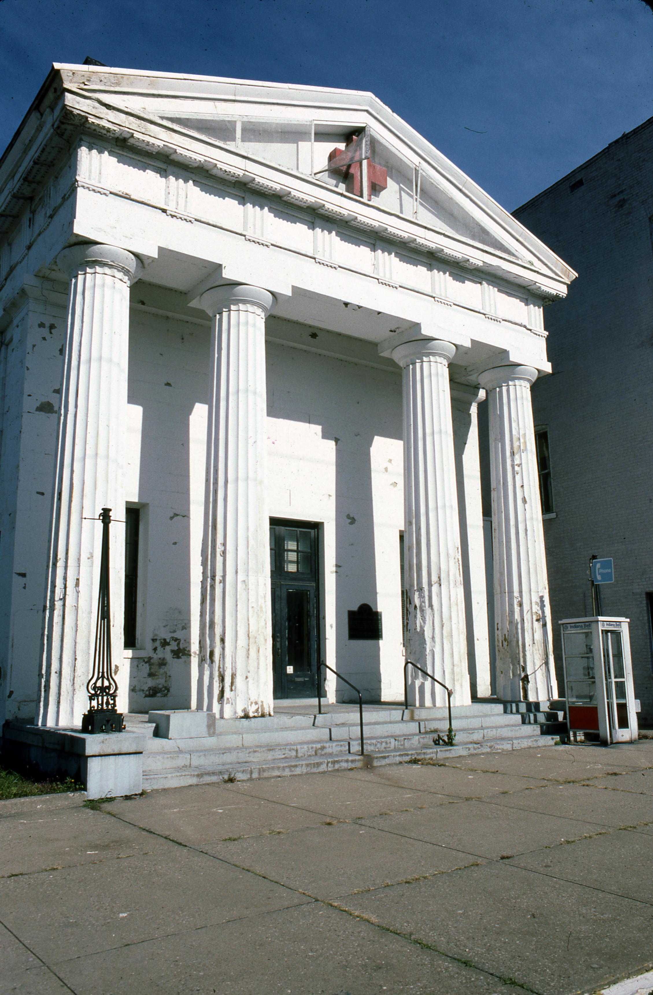 Indiana State Bank at 203 E. Main St. Its historic marker reads, Second state bank was established in 1834 by General Assembly with ten branch banks, one of the most successful banks at the time in U.S. This Greek Revival Style structure, built 1837, housed New Albany branch, serving Floyd, Harrison, Washington, Crawford, and Clark counties until expiration of the bank charter in 1857.Why there is a cross in the pediment is unknown-perhaps it was used by the Red Cross. This cross is no longer there, and today's building is in much better condition and has a decorative fence surrounding it.