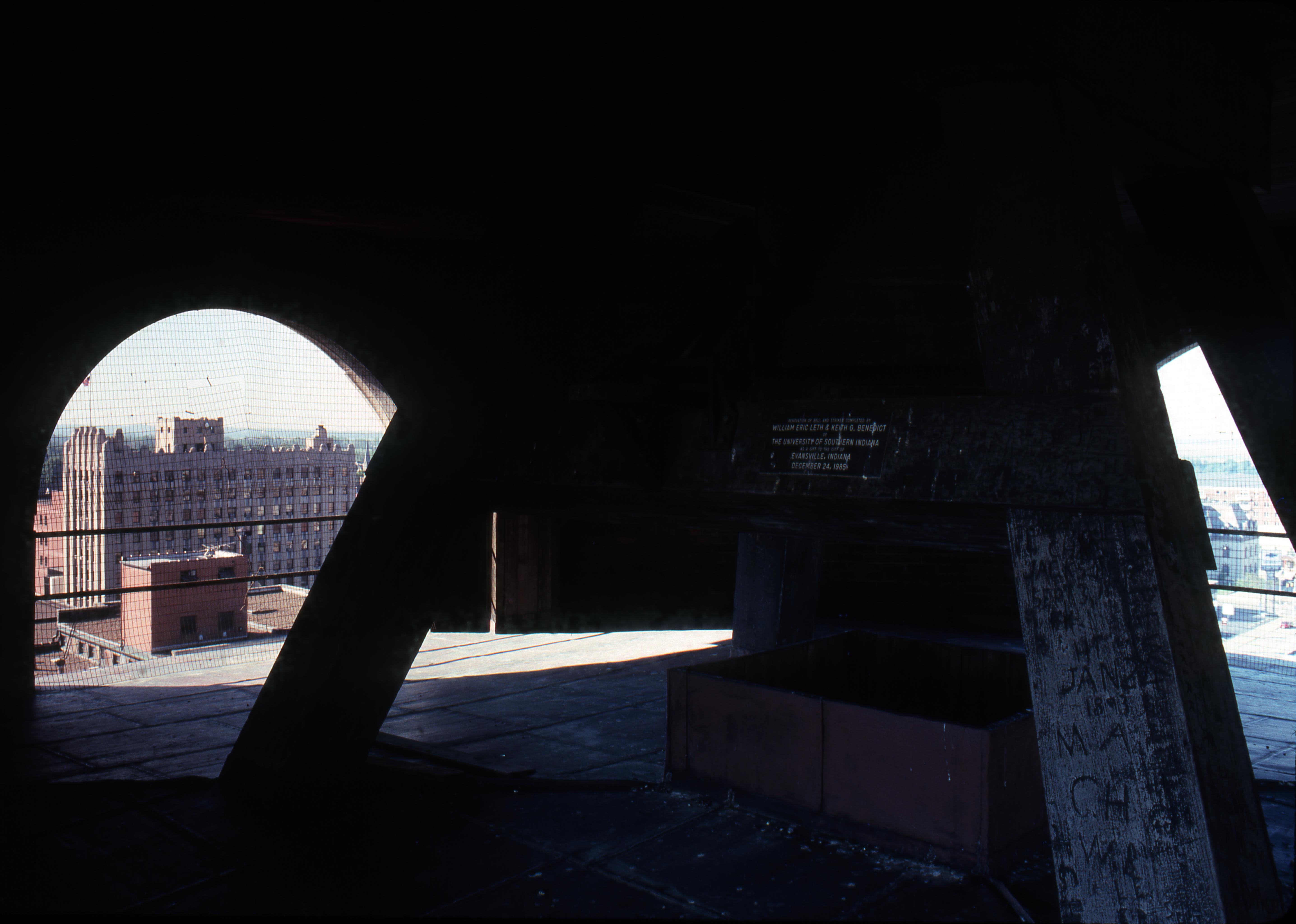 Sign inside the bell tower of the old Vanderburgh County courthouse, Restoration of the bell and tower completed by William Eric Leth and Keith G. Benedict of the University of Southern Indiana as a gift to the city of Evansville, Indiana December 24, 1985.Located at 201 NW 4th St., the courthouse was completed in 1890. The building still stands, but is now referred to as the old courthouse, as government offices moved into another building in 1969. The courthouse spans the block between NW 4th St. and NW 5th St., bounded by Vine St. and Court St. The bell tower, as unique as the statues and carvings on the exterior of the building, rises above the Old Courthouse to a height of approximately 190 feet. The first level of the tower is enclosed but surrounded with windows which allow an abundance of sunlight to enter. The next level is open and houses the 4500 pound Old Courthouse bell. The bell, manufactured by McShane Bell Foundry located in Baltimore, Maryland, has tolled at the Old Courthouse since August 20, 1890. The next level is enclosed and houses only the pulleys and inner workings of the clock. The four faces of the clock, each measuring seven and one-half feet in diameter with one facing each side of the building, are found on the final level of the tower. Finally, found on this level of the tower is a suspended staircase which winds to the top of the copper-clad central dome of the Old Courthouse, the base of the cupola sits atop the dome. The courthouse sits on ground that was once the turnaround for the Wabash and Erie Canal.
