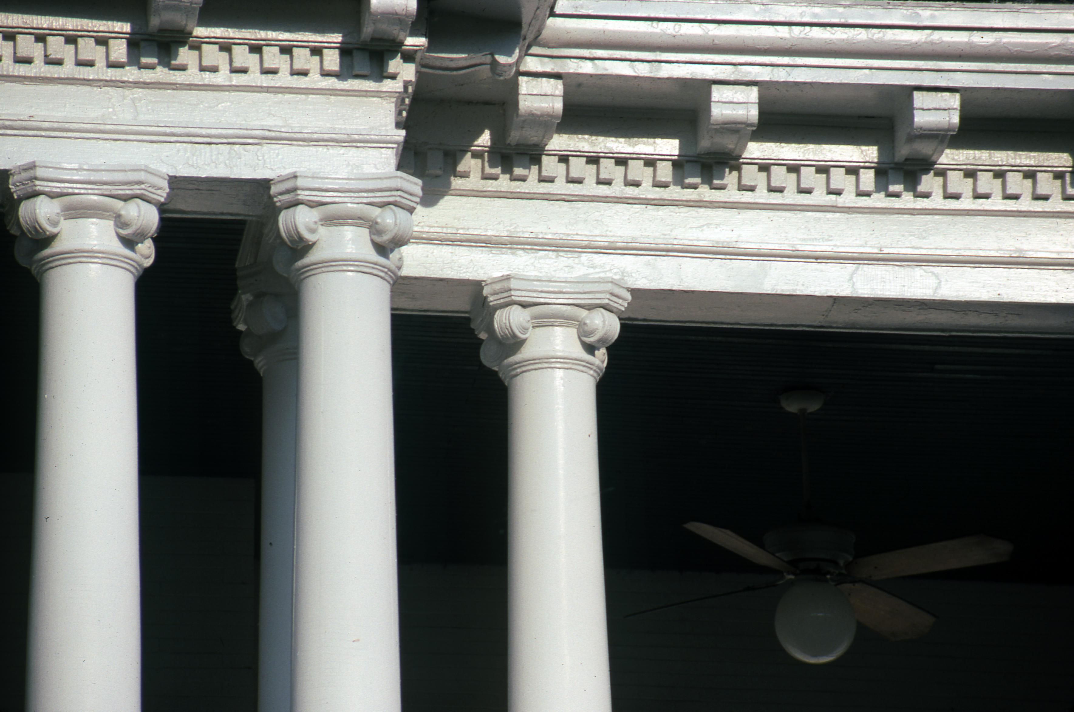 Front porch detail at French Lick Springs Hotel at 8670 W. State Road 56. For more than 170 years, a lodging establishment has operated at the current site of French Lick Springs Hotel. It all began with Dr. William Bowles and continued to thrive under various owners. It was under Tom Taggart's innovative direction that French Lick Springs Hotel made great strides in d�cor, development and transportation. He also built pavilions for the springs and added a new bath building on the current site of the Spa at French Lick Springs Hotel. After Taggart�s son eventually sold the hotel, it was owned by five companies over a span of 60 years, operating out of five different states. In 2005, French Lick Springs Hotel was purchased by Indiana-based Cook Group, Inc. and after a complete restoration, it returned the hotel back to its historic splendor. In 1845, Dr. William Bowles, a physician from nearby Paoli, Indiana, built a three-story wooden framed hotel he named French Lick Springs Hotel. Bowles used his knowledge as a physician to explore the healing properties of the abundant mineral springs in this area. Outgoing mayor of Indianapolis, Tom Taggart, along with a small group of investors, formed the French Lick Hotel Company and bought the property in 1901. Taggart�s improvements included enlarging the east wing (now known as the Spa Wing), encouraging the Monon Railroad to lay a special spur and run daily trains between Chicago and the front entrance of the hotel, and modernizing and expanding the mineral springs for which the hotel was becoming famous. He used the yellow French Lick Brick, scagliola (faux marble) and Italian mosaic floors. He also built a new bottling house for water from his Pluto Spring for national distribution and brought electricity, a freshwater system and a trolley line to the town. While French Lick Springs Hotel was expanding, the game of golf was gaining popularity worldwide. In 1907, Taggart hired Tom Bendelow to design the resort�s first championship golf course, known at the time as the Springs Valley Golf Links Course. Bendelow�s design was completed by 1910. In 1917, Donald Ross � a well-known golf architect � was hired to design and build the French Lick Springs Golf Course two miles southwest of French Lick Springs Hotel. The locals referred to it as �The Hill Course.� Completed in three years, Ross�s course consisted of unconventional bunkers and steep curves. . In the spring of 2005, a partnership led by Cook Group, Inc., a global medical device manufacturing company headquartered in Bloomington, Indiana, purchased French Lick Springs Hotel and West Baden Springs Hotel. Under the direction of Bill and Gayle Cook and their son Carl, both hotels and their grounds received a multi-million dollar renovation, returning them to the grandeur of the days of Taggart and uniting them as one resort. That summer, with renovation work underway, Blue Sky, LLC officially acquired the 11th and last available casino license from the Indiana Gaming Commission. French Lick Springs Hotel remained open during the beginning of construction, but as concerns arose, the hotel was forced to close in November. The Donald Ross Course at French Lick (formerly the Hill Course) reopened in September 2006 after a $4.6 million restoration. This rehaul returned the course to Donald Ross� early vision. One year after closing, French Lick Springs Hotel reopened after an extensive renovation. On the same day, the French Lick Casino held its grand opening, becoming the first land-based casino in Indiana. With the completion of the West Baden Springs Hotel restoration in 2007, French Lick Resort was born. This restoration means the hotel looks much better today than is seen in these photographs.