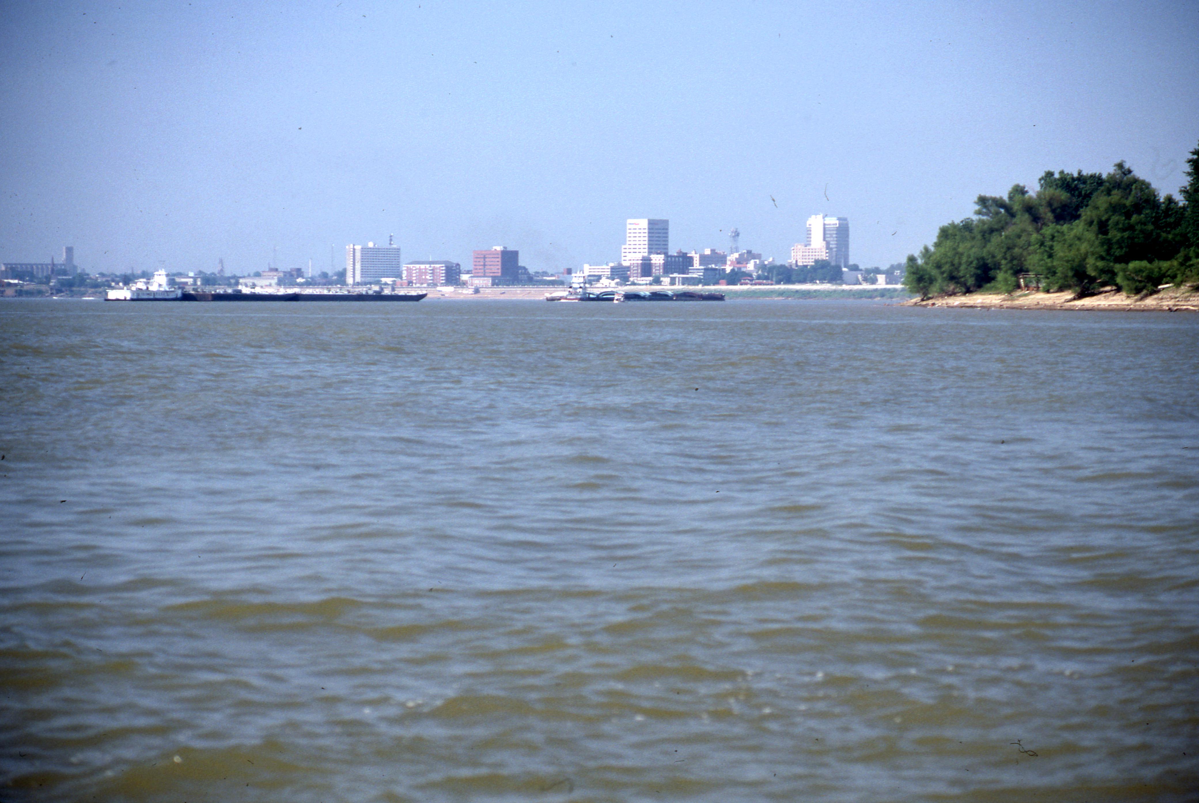Looking from the Ohio River back at a portion of downtown Evansville. NOTE this view is taken from the opposite direction as MSS 124-062. The tall building on the far right is the Old National Bank tower at 420 Main St. The Old State National Bank was established circa 1835. and around 1883/1885 was renamed Old National Bank. In 1916 it moved to a building immediately next to this one. In 1970 it moved into the building seen here, and the 1916 building was razed. This building still exists, but the bank has moved into a new building. The tall building just right of center is Citizens National Bank at 20 NW 3rd St. It began in Evansville in 1874 at a 1st St. location, and moved to a Main St. location in 1884 after consolidation with 2 other banks. It moved to another Main St. location in 1916 and at 10 stories tall, was the first skyscraper. At sometime in the late 1950s or early 1960s the bank moved again, just a block away from the last Main St. address, to the location shown here. This is also known as the Sycamore building. This building is still standing, although today this is Fifth Third Bank. The brick building in the center is an office building, at 20 NW 1st St. The next brick building is across Sycamore St. from the office building, at 100 NW 1st St., Riverfront Condominiums. The last easily identifiable tall building is Riverside One, a luxury apartment complex at 101 Court St. This building no longer stands-today the headquarters for Vectren are in this location.