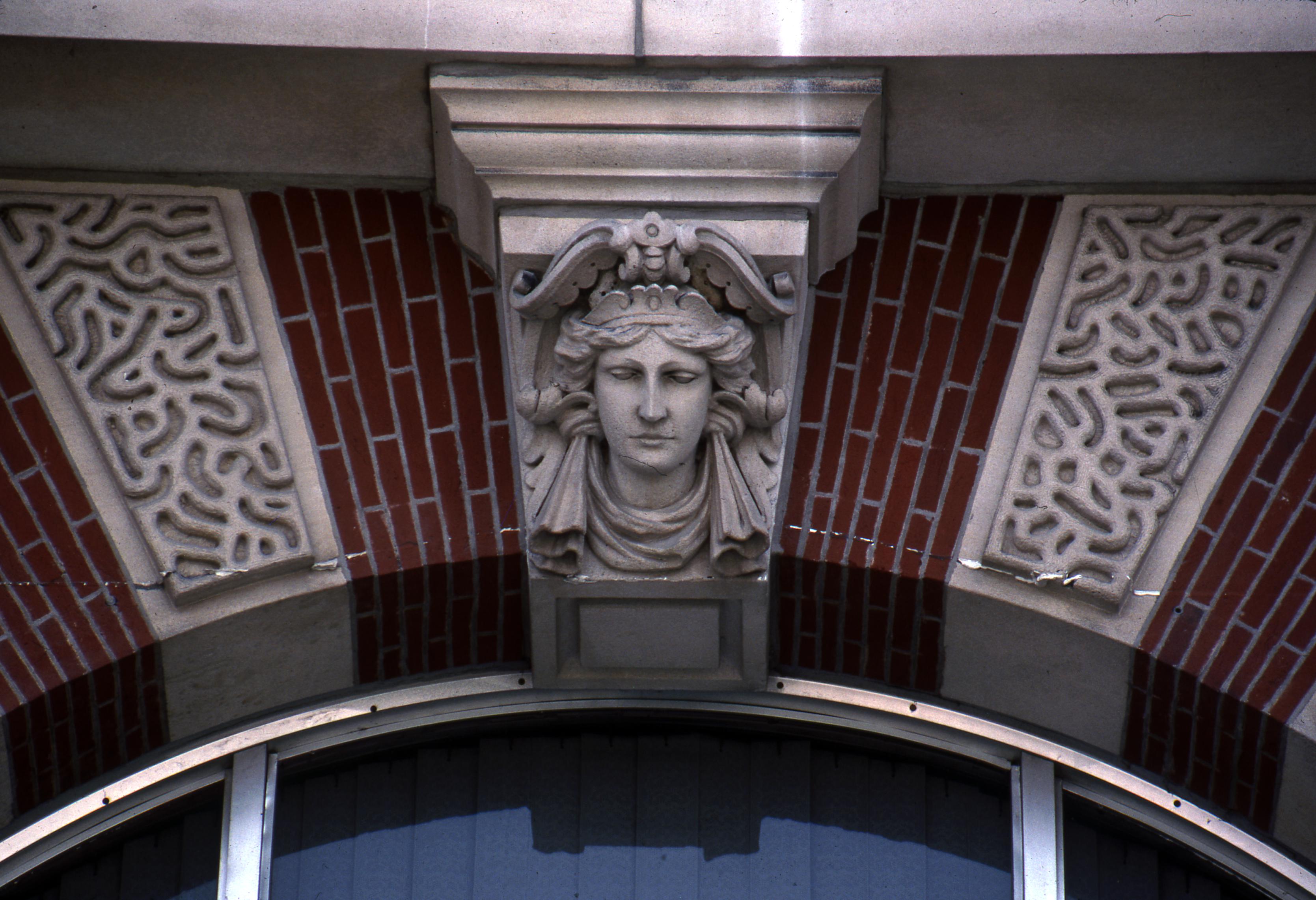 Close-up detail of the Gibson County Courthouse at 101 N. Main St. (corner of IN 64 and IN 65) This is the third courthouse for Gibson County, built in 1884 (and was the model for Department 56's Original Snow Village Courthouse.) This is either the Main St. or the Hart St. side.