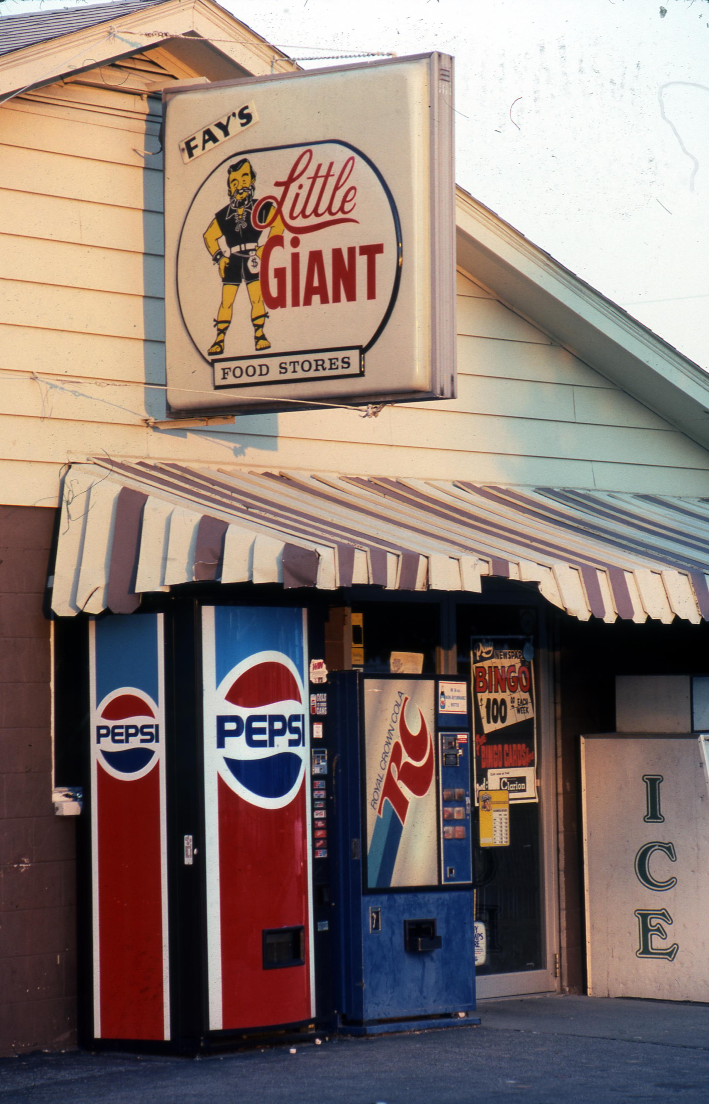 Fays Little Giant Food Store, location unknown, although this almost certainly no longer exists. A 2012 obituary was found for Thelma Faye (Neufelder) Oing that stated that she had once owned this business, among many others.