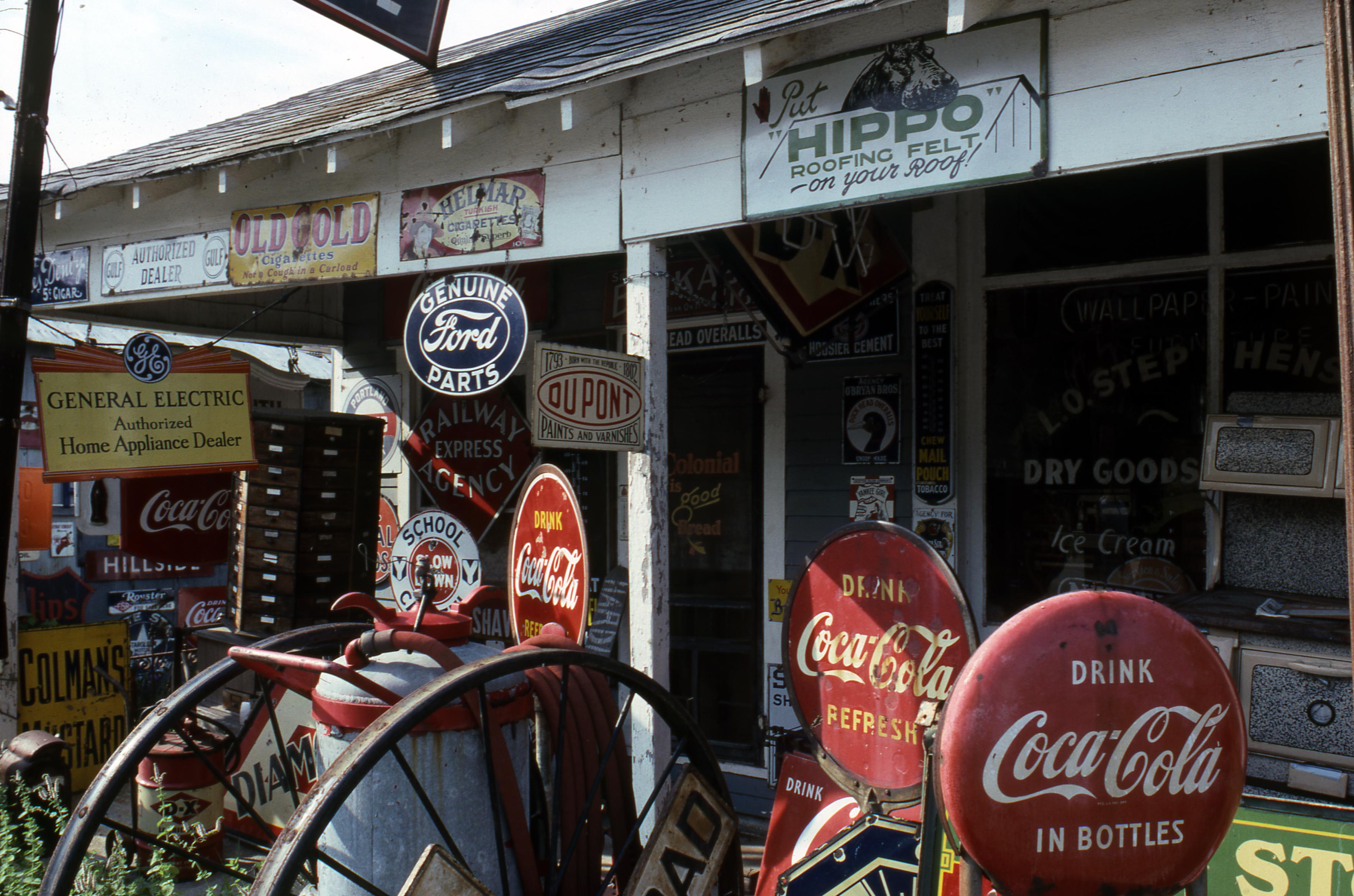 Sign collection on Route 50/150 in Chambersburg. A series of buildings resembling this, but without any signs, was located on this road near the intersection of Huffman Orchard Rd. Identification was based on the presence of the No Trespassing sign seen in photographs MSS 124-473 through 475.
