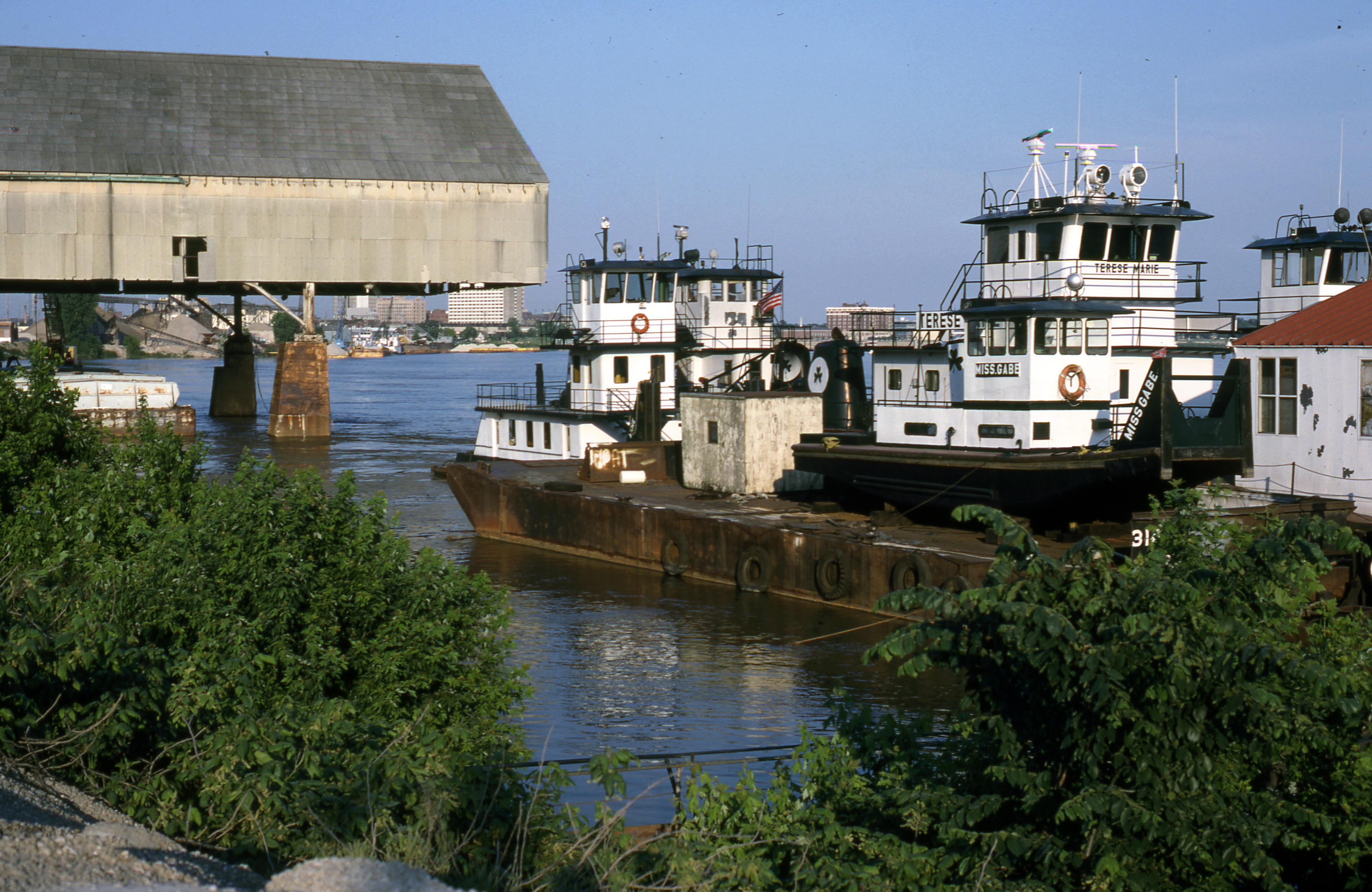 Two towboats on the Ohio River, the closest is the Miss Gabe and the other is the Terese Marie. They are by the Mead Johnson River-Rail-Truck Terminal at 1830 W. Ohio St., where cargo could be taken from barges and put directly into rail cars. Wikipedia provides this information, The Mead Johnson River-Rail-Truck Terminal and Warehouse is a historic terminal-warehouse at the Port of Evansville in Evansville, Indiana. The complex was built in 1931 and consists of the terminal building and warehouse. The terminal building is a rectangular canopied structure measuring 285 feet long, 110 feet wide, and 62 feet high. The building is cantilevered 45 feet over the Ohio River. The terminal is serviced by two electric cranes that each measure 54 feet long. The original warehouse is 585 feet long and 150 feet wide. It was enlarged by a 310-foot addition in 1957.