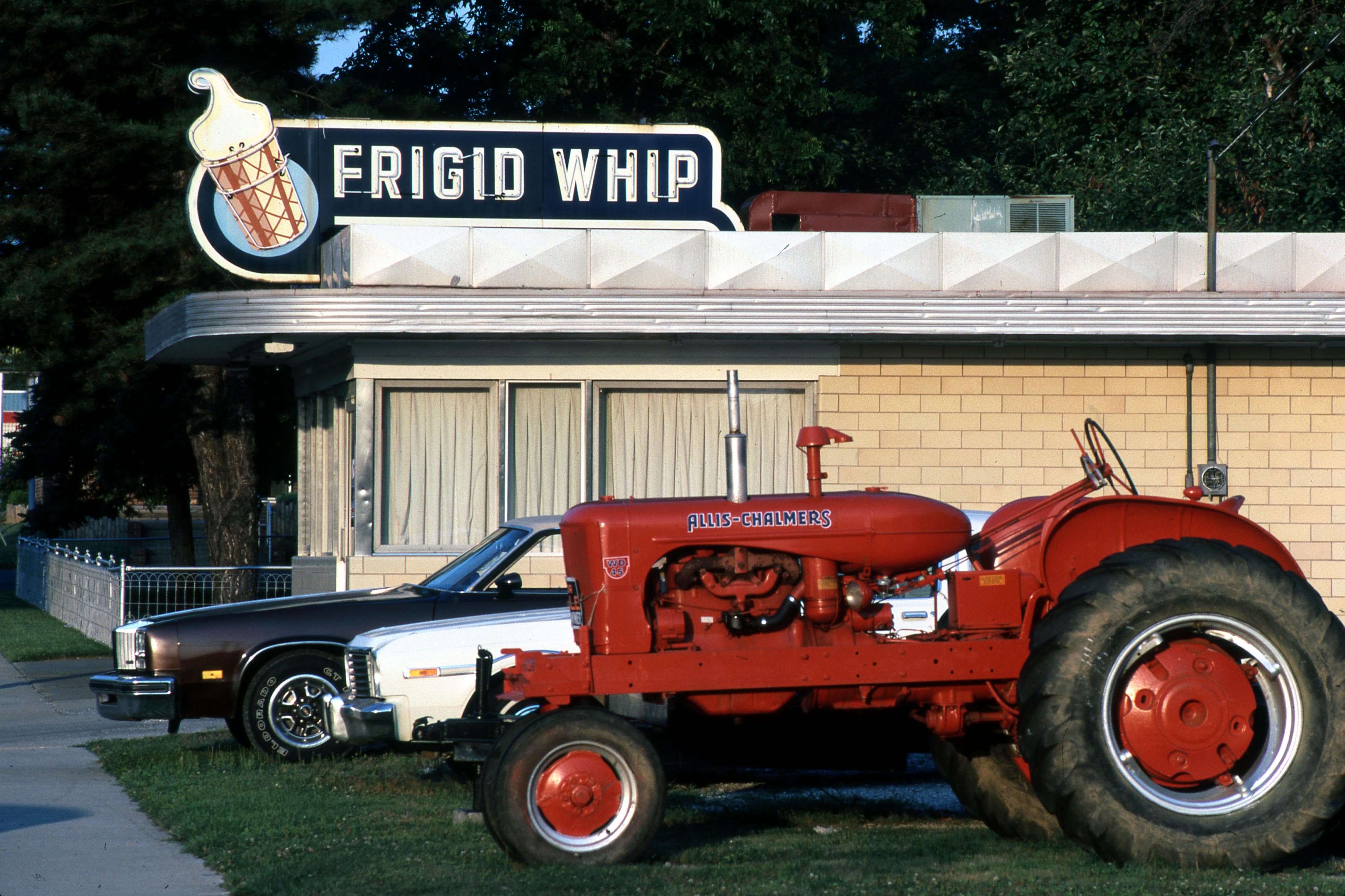 Tractor and two cars in front of Frigid Whip building in Tell City, Indiana. The Frigid Whip opened in 1950 on Tell St., between 9th and 10th Sts. It served frozen custard and hot dogs. Today the building still stands, sans sign, and is believed to house an antique store.