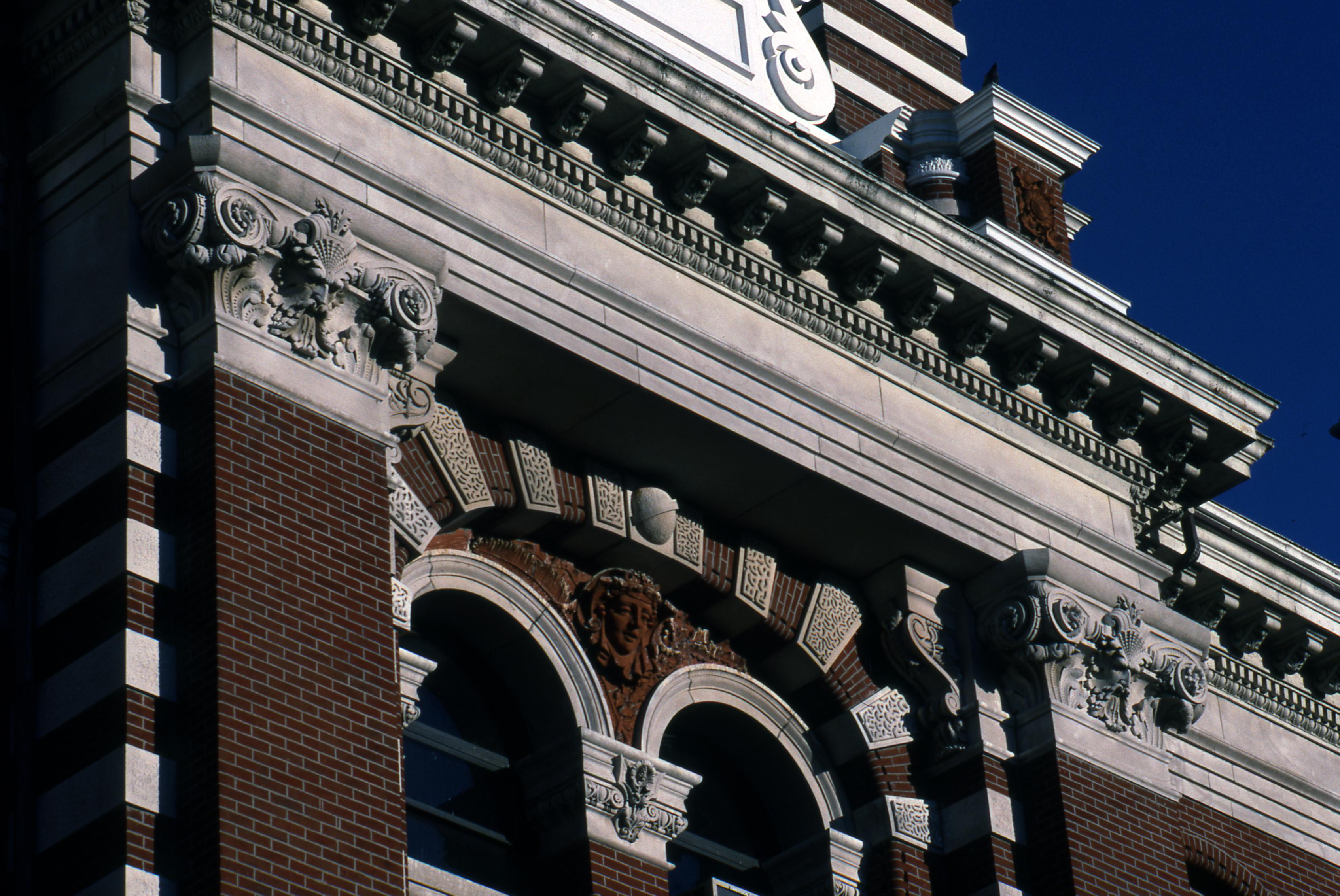 Detail of the Gibson County Courthouse at 101 N. Main St. (corner of IN 64 and IN 65) This is the third courthouse for Gibson County, built in 1884 (and was the model for Department 56's Original Snow Village Courthouse.) This is either the Main St. or the Hart St. side.