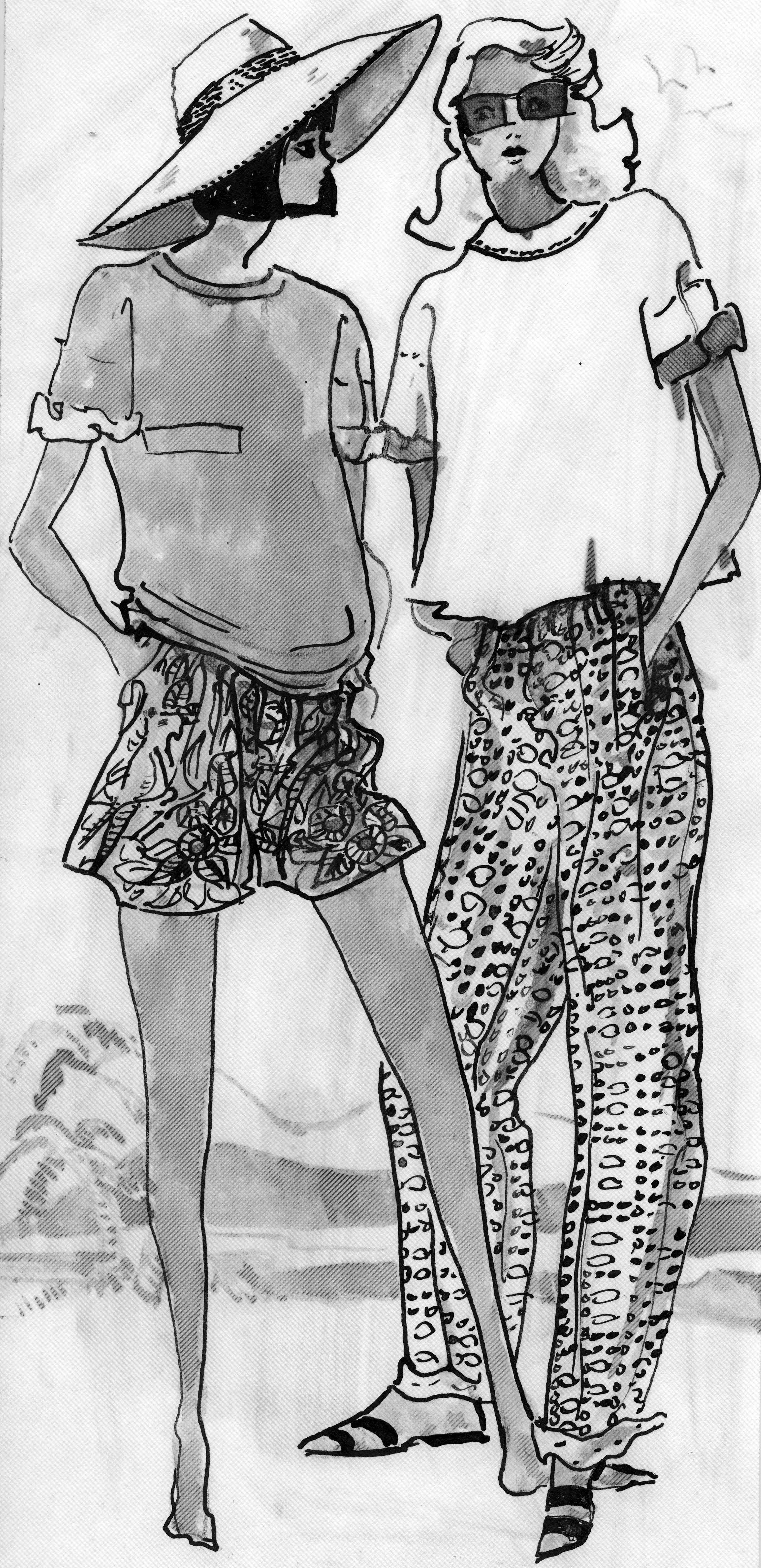 Sketch of 2 women wearing T-shirts over loose shorts and pants. This is a cut out of the advertisement but has no copy, nor it is mounted on board like others in the collection.
