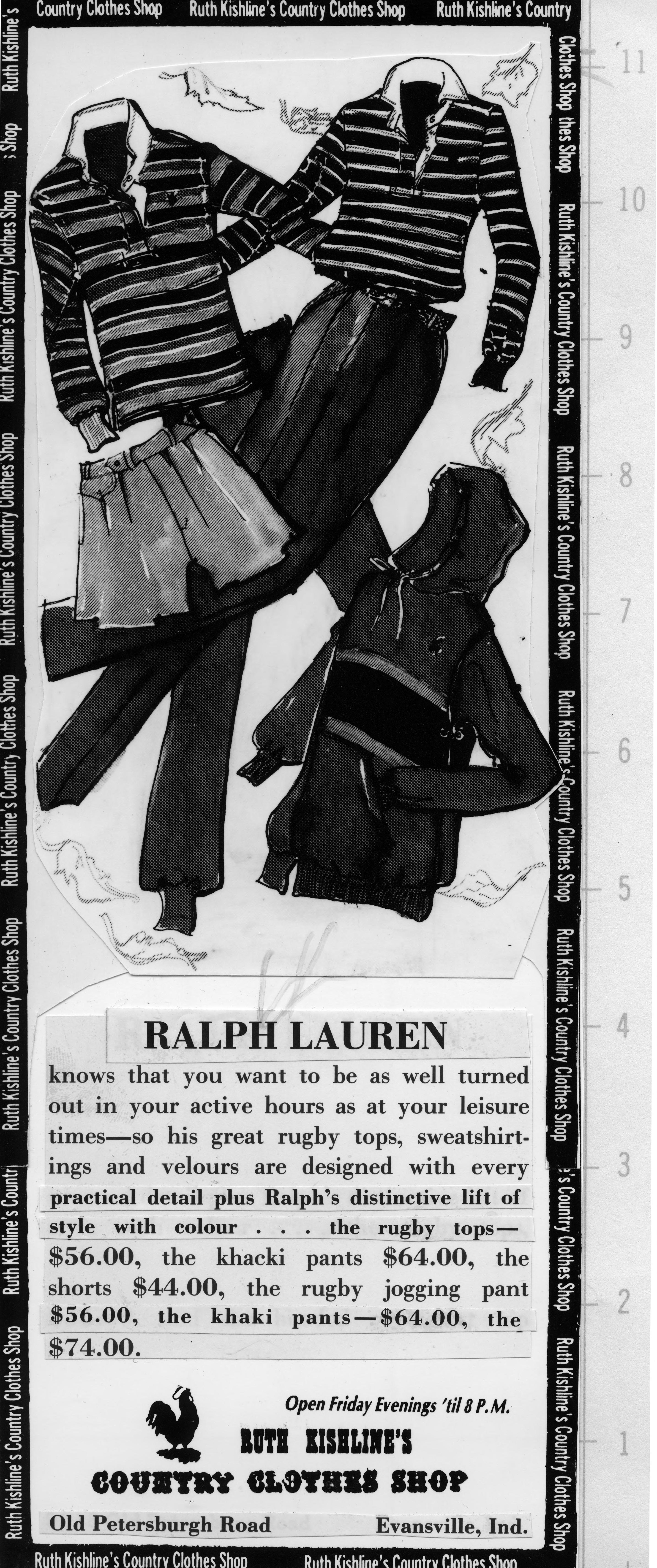 Sketch of Ralph Lauren separates--tops, shorts, pants, and a hooded jacket. This is the cut out of the advertisement, and the copy reads, Ralph Lauren knows that you want to be as well turned out in your active hours as at your leisure times--so his great rugby tops, sweatshirtings and velours are designed with every practical detail plus Ralph's distinctive lift of style with colour..the rugby tops--$56.00, the khacki [sic] pants $65.00, the shorts $44.00, the rugby jogging pant $56.00, the khaki pants--$64.00, the $74. (words seemingly missing but transcribed as seen). The text also includes the name of the store, the address, and Friday hours. Ralph Lauren (born Ralph Lifshitz; October 14, 1939) is an American fashion designer, philanthropist, and business executive, best known for the Ralph Lauren Corporation, a global multibillion-dollar enterprise. .From 1962 to 1964 he served in the United States Army and left to work briefly for Brooks Brothers as a sales assistant before becoming a salesman for a tie company. The Ralph Lauren Corporation started in 1967 with men's ties. At 28 years old, Lauren worked for the tie manufacturer Beau Brummell, where he convinced the company's president to let him start his own line. Drawing on his interests in sports, Ralph Lauren named his first full line of menswear �Polo' in 1968. He worked out of a single drawer from a showroom in the Empire State Building and made deliveries to stores himself. By 1969, the Manhattan department store Bloomingdale's sold Lauren's men line exclusively. It was the first time that Bloomingdale's had given a designer their own in-store boutique. In 1971, Ralph Lauren Corporation launched a line of tailored shirts for women, which introduced the Polo player emblem to the world for the first time, appearing on the shirt's cuff. The first full women's collection was launched the following year. 1971 also marked the opening of Ralph Lauren's store on Rodeo Drive in Beverly Hills, California. This is the first freestanding store for an American designer. In 1972 the Ralph Lauren Corporation introduced a signature cotton mesh Polo shirt in various colors. Featuring the polo player logo at the chest, the shirt became emblematic of the preppy look--one of Ralph Lauren's signature styles. The tagline for the ad campaign was: Every team has its color � Polo has seventeen.