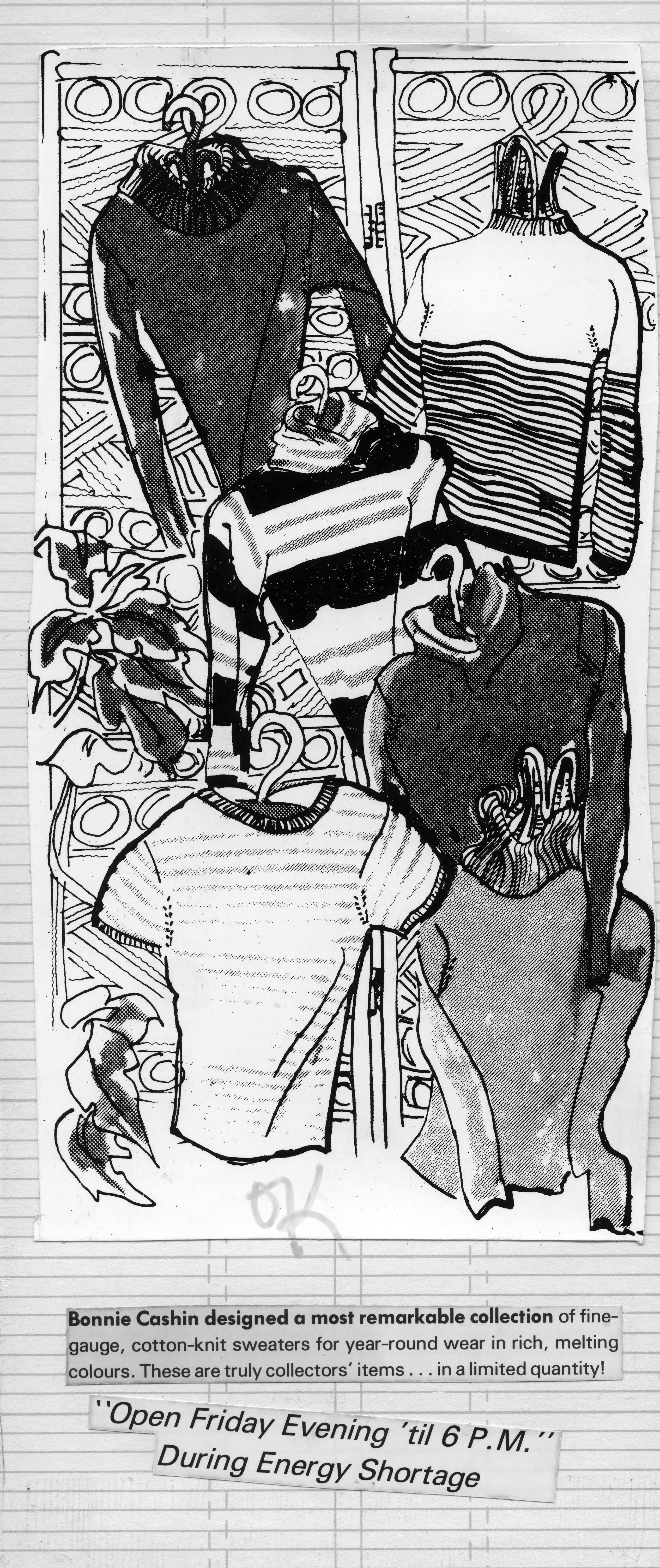 Sketch of 6 sweaters, one short sleeved. This is the cut out of the advertisement, and the copy reads, Bonnie Cashin designed a most remarkable collection of fine-gauge, cotton-knit sweaters for year-round wear in rich, melting colours. These are truly collectors' items.in a limited quantity! The text also includes this: Open Friday Evening 'til 6 P.M. During Energy Shortage. Bonnie Cashin (September 28, ca. 1908� February 3, 2000) was an American designer and is considered one of the pioneering designers of American sportswear. She created practical, uncomplicated clothing that catered to the independent woman of the post-war era. . Cashin is often cited creating both the concept of layering clothing and for coining the term. The idea of layering came from time she spent in Asia. Her use of leather, mohair and hardware was pioneering and the brass turnlocks that kept the top of her 1940s convertible down became a signature feature of Coach handbags.