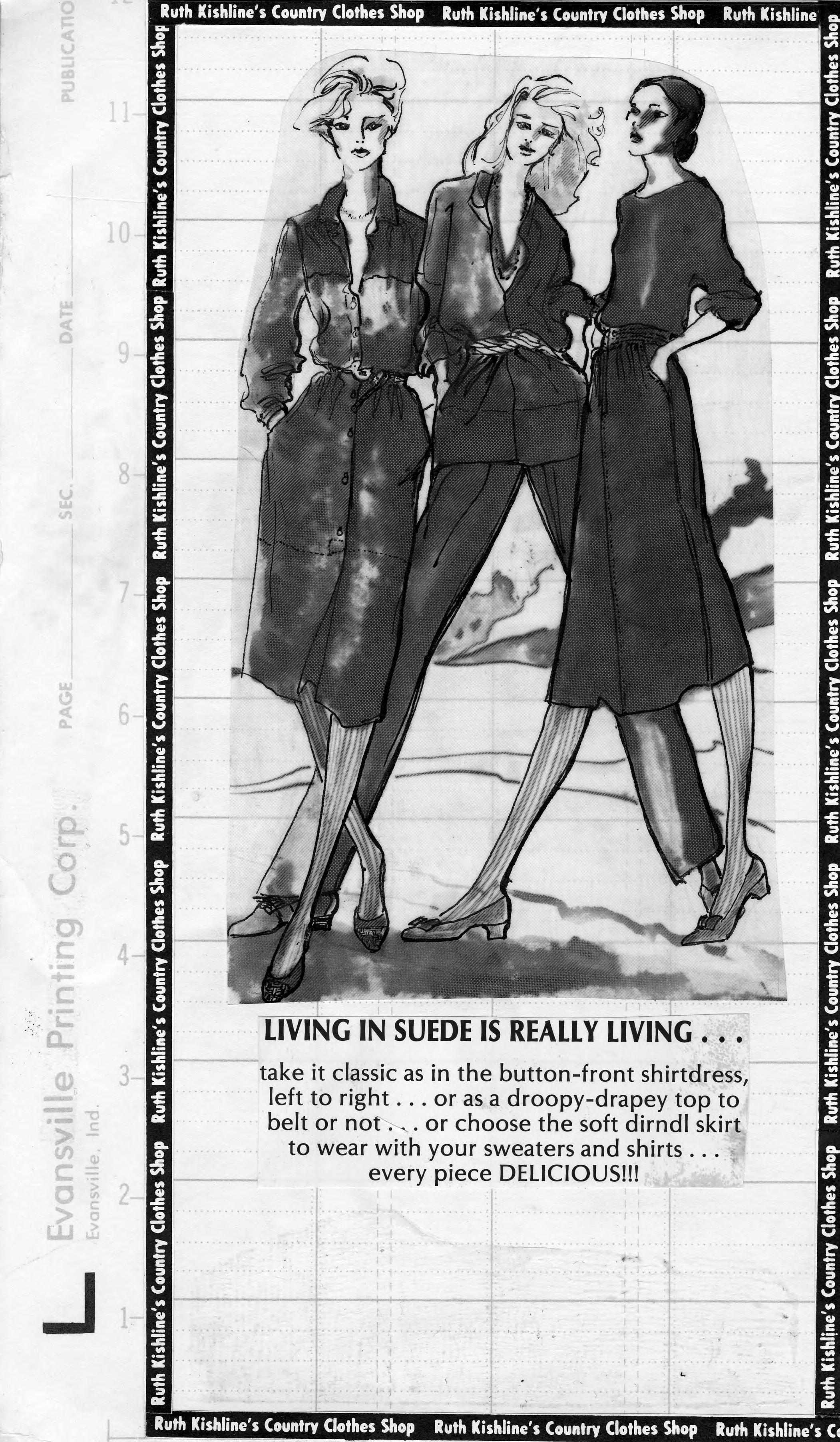 Sketch of 3 women wearing a shirtdress, pantsuit with tunic top, and top and skirt. This is the cut out of the advertisement, and the copy reads, Living in sude is really living�take it classic as in the button-front shirtdress, left to right...or as a droopy-drapey top to belt or not...or choose the soft dirndl skirt to wear with your sweaters and shirts...every piece DELICIOUS!!! The text also includes the name of the store.