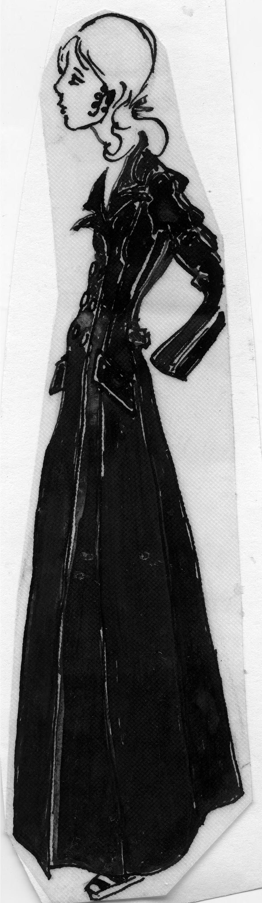 Sketch of a woman wearing a ankle-length coat--the size and darkness of the illustration make noting other details difficult. This is the cut-out of an advertisement.