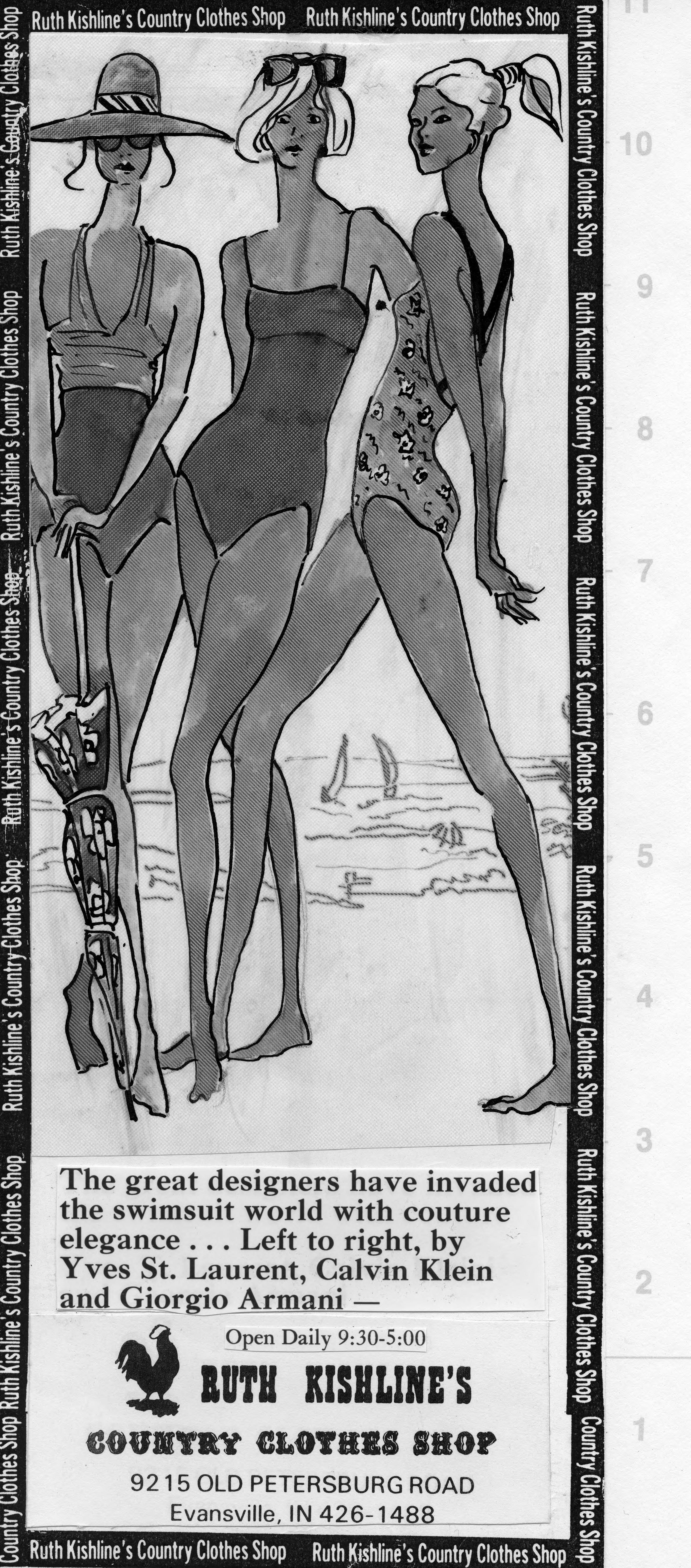 Sketch of 3 women wearing one piece bathing suits. This is the cut out of the advertisement, and the copy reads, The great designers have invaded the swimsuit world with couture elegance.Left to right, by Yves St. Laurent, Calvin Klein and Giorgio Armani-- The text also includes the name of the store, the address, and regular hours. The date of April 15, 1988 is stamped on the back. �Yves Henri Donat Mathieu-Saint-Laurent (1 August 1936 � 1 June 2008), professionally known as Yves Saint-Laurent, was a French fashion designer who, in 1961, founded his eponymous fashion label. He is regarded as being among the foremost fashion designers in the twentieth century. In 1985, Caroline Rennolds Milbank wrote, The most consistently celebrated and influential designer of the past twenty-five years, Yves Saint Laurent can be credited with both spurring the couture's rise from its 1960s ashes and with finally rendering ready-to-wear reputable. He was able to adapt his style to accommodate the changes in fashion during that period. He approached fashion in a different perspective by wanting women to look comfortable yet elegant at the same time. He is also credited with having introduced the tuxedo suit for women and was known for his use of non-European cultural references, and non-white models.� Calvin Klein is a global lifestyle brand that exemplifies bold, progressive ideals and a seductive, and often minimal, aesthetic. We seek to thrill and inspire our audience while using provocative imagery and striking designs to ignite the senses. After nearly 50 years, Calvin Klein continues to be a cultural catalyst across the globe by embracing tension, sparking ideas and creating unforeseen realities. We believe in a culture that provokes discovery and brave thinking. We strive to make a positive impact on the world. We inspire passion in our people. We embody authenticity and embrace individuality. Founded in 1968 by Calvin Klein and his business partner Barry Schwartz, we have built our reputation as a leader in American fashion through our clean aesthetic and innovative designs. Global retail sales of Calvin Klein products exceed $8 billion in 2015 and were distributed in [over] 110 countries. Calvin Klein employs over 10,000 associates globally. In 2003, we were acquired by PVH Corp., one of the largest apparel companies in the world. With a history going back over 130 years, PVH has excelled at growing brands and businesses with rich American heritages, becoming one of the largest global apparel companies. We have over 30,000 associates operating in over 40 countries with over $8 billion in revenues. We own the iconic Calvin Klein, Tommy Hilfiger, Van Heusen, IZOD, ARROW, Speedo*, Warner�s and Olga brands and market a variety of goods under these and other nationally and internationally known owned and licensed brands. (https://explore.calvinklein.com/en_US/corporate) �Giorgio Armani (born 11 July 1934) is an Italian fashion designer. He is known today for his clean, tailored lines. He formed his company, Armani, in 1975, and by 2001 was acclaimed as the most successful designer of Italian origin, with an annual turnover of $1.6 billion and a personal fortune of $8.1 billion as of 2017. He is credited with pioneering red-carpet fashion.�