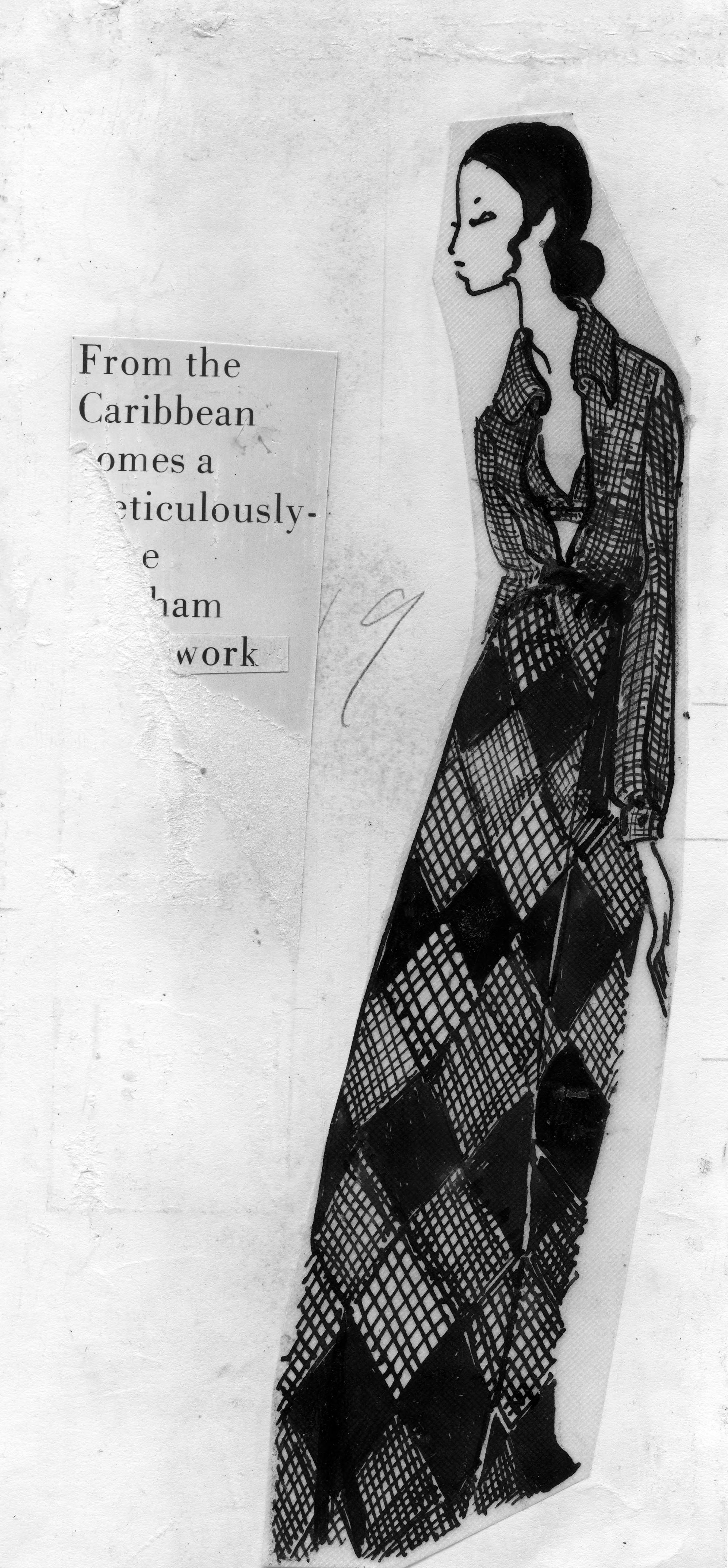 Sketch of a woman wearing a long dress with diamond pattern--the blouse is open to show a matching bra so this is probably a swimsuit cover-up. This is the cut-out of the advertisement, and the copy (partially missing) reads, From the Caribbean comes a meticulously.......work. Text on the back says that the model was Ruth K., possibly the Ruth Kishline that is the originator of this collection.