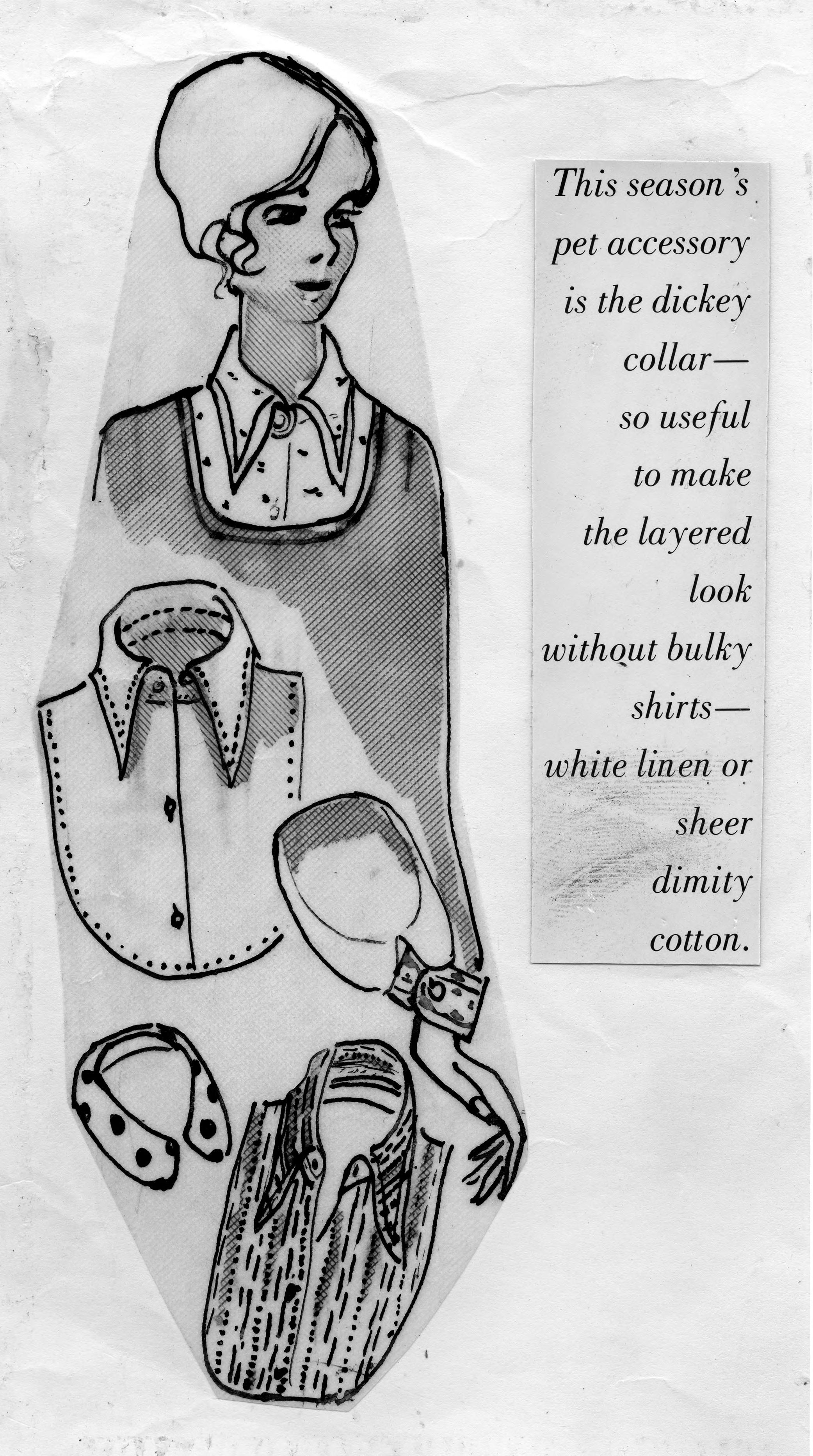 Sketch of a dickeys and collars. This is the cut-out of an advertisement, and the copy reads, This season's pet accessory is the dickey collar--so useful to make the layered look without bulky shirts--white linen or sheer dimity cotton.
