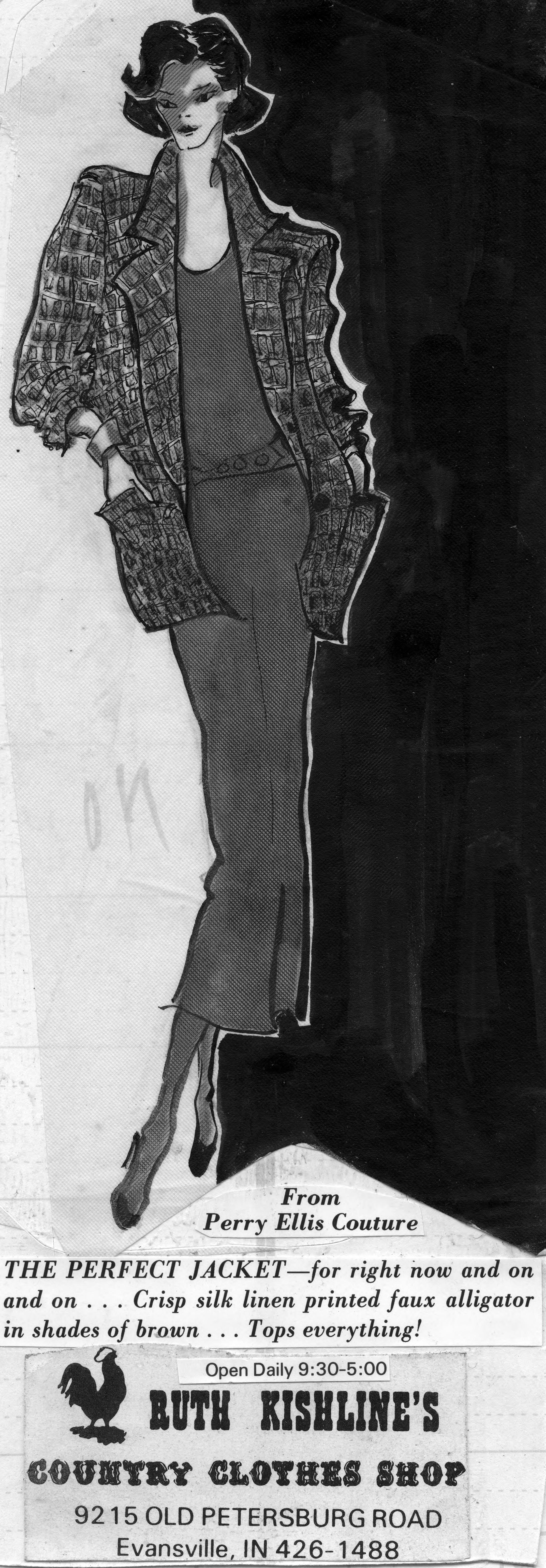 Sketch of a woman wearing a printed jacket with top and straight skirt, mid-calf length. This is the cut out of the advertisement, and the copy reads, From Perry Ellis Couture. The perfect jacket--for right now and on and on.Crisp silk linen printed faux alligator in shades of brown.Tops everything! The text also includes the name of the store, the address, and regular hours. The date of Aug. 17 is written on the back. �Perry Edwin Ellis (March 3, 1940 � May 30, 1986) was an American fashion designer who founded his eponymous sportswear house in the mid-1970s. Ellis' influence on the fashion industry has been called a huge turning point because he introduced new patterns and proportions to a market which was dominated by more traditional men's clothing.�