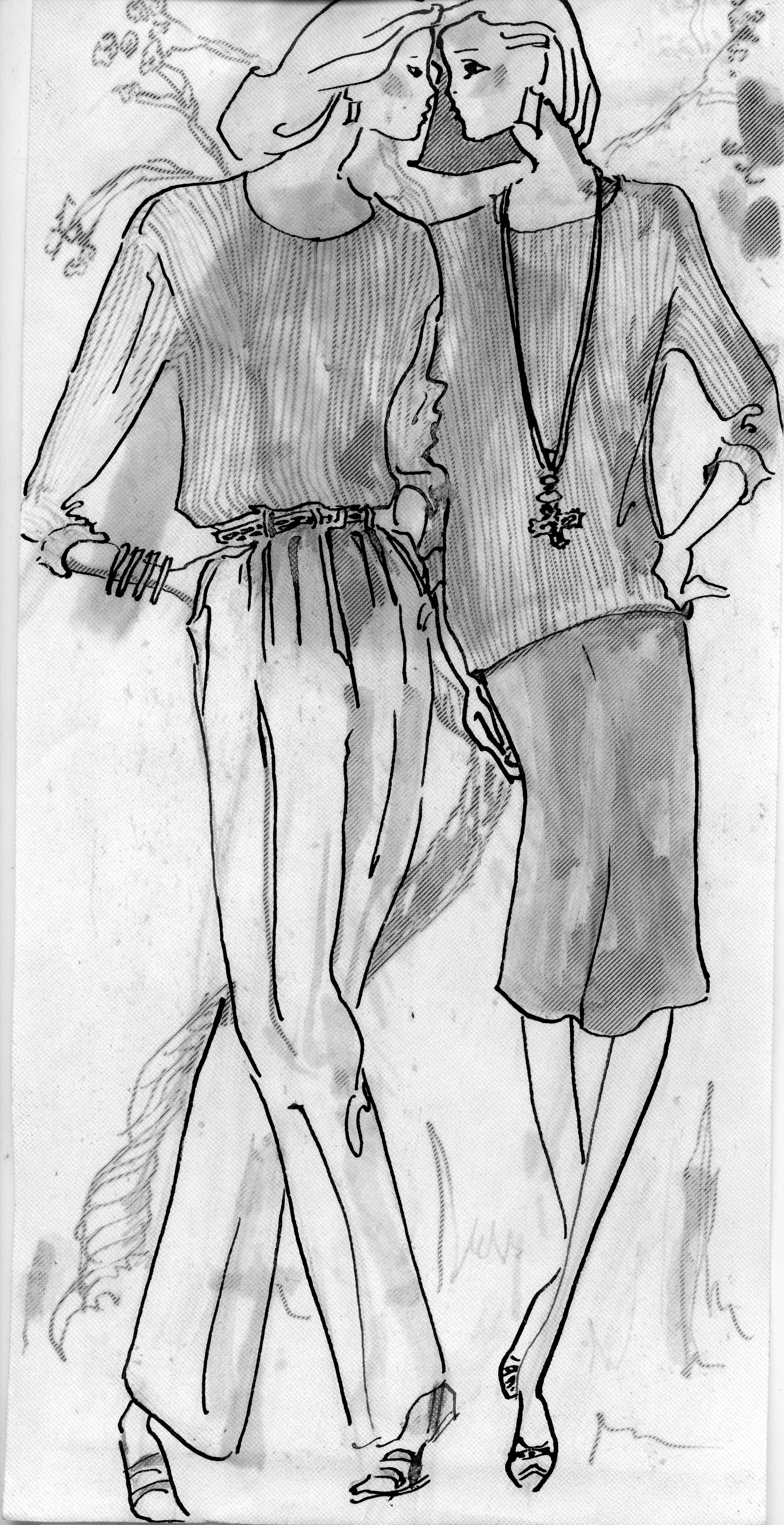 Sketch of 2 women wearing the same sweater, tucked into pants and over a skirt. This is the cut out of the advertisement, but there is no copy and it is not mounted on board as are others in the collection. Attached to the picture are instructions for camera copy.