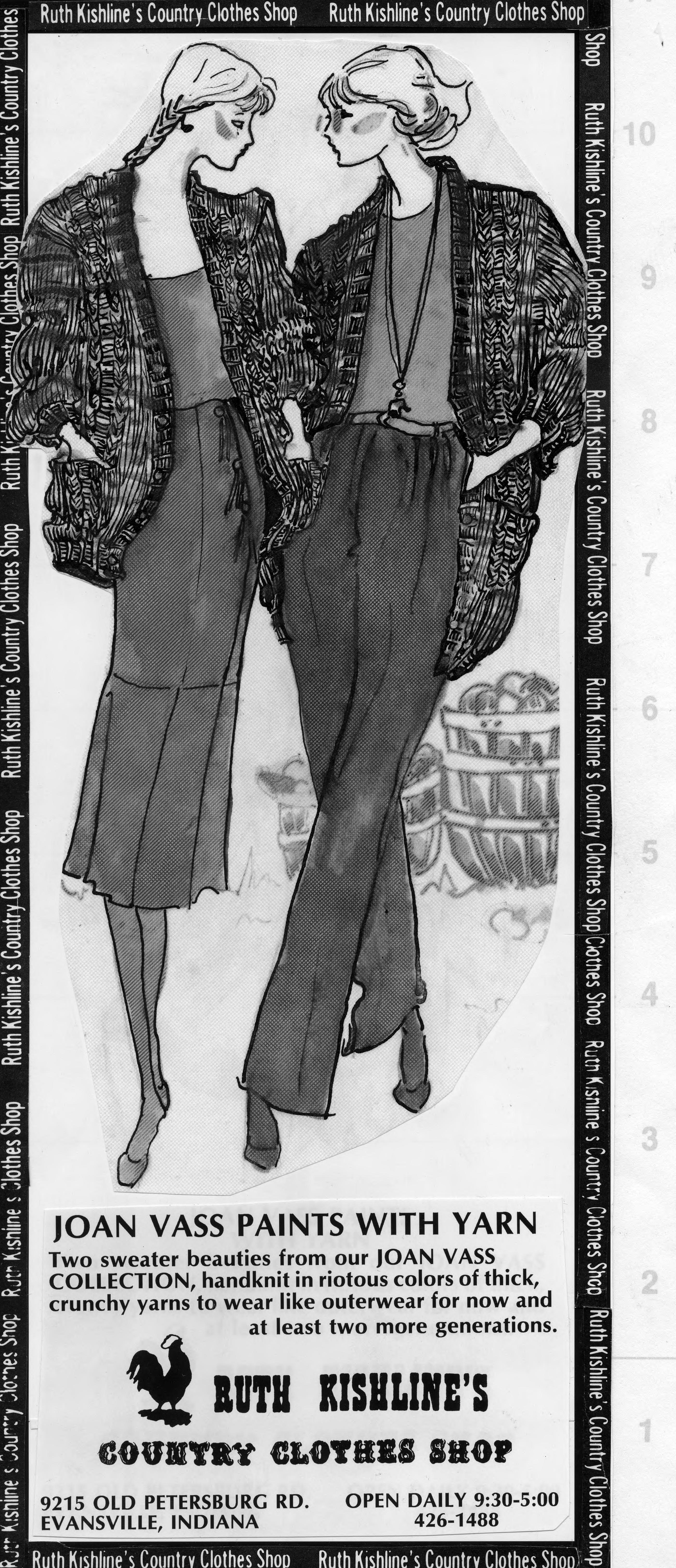 Sketch of 2 women wearing heavy sweaters over a skirt and pants. This is the cut out of the advertisement, and the copy reads, Joan Vass paints with yard. Two sweater beauties from our Joan Vass Collection, handknit in riotous colors of thick, crunchy yards to wear like outerwear for now and at least two more generations. The text also includes the name of the store, the address, and regular hours. The date of September 8, 1989 is stamped on the back. �Drawing upon her education in philosophy and aesthetics, Joan Vass set out to work in the art world. Beginning as an assistant curator of drawing and prints at the Museum of Modern Art, she then went on to edit art tomes for Harry N. Abrams and as a contributing columnist for Art in America. It was during this time that Joan developed an interest in hand knits & crochets. She tapped into the skills of local women to produce her first designs. This collection, consisting of hats & mufflers, was bought by arbiter of fashion, Henri Bendel. It quickly sold out, changing Joan�s career from observer of art to creator of art. Incorporated in 1977, her eponymous collection expanded into sweaters for both sexes. Using the same local artisans, the designs were unique, limited and beautifully crafted. Demand for Joan�s quirky unstructured knitwear grew during the 1980�s prompting large scale production at Signal Knitting Mills in South Carolina under the label Joan Vass USA. Encompassing all the components of a complete wardrobe � sweaters, trousers, skirts & dresses, the aesthetic remained the same, with fine fabrics, natural fibers and ageless designs. Joan�s unique approach, that of eliminating the excess, leaving a timeless, seasonless collection garnered her many accolades, including the Extraordinary Women in Fashion award from the Smithsonian Institute, Coty American Fashion Critics award and the Prince Machiavelli Prix de Cachet award. The Joan Vass brand continues today with renewed attitude. Building on the tradition of luxurious knitwear since its inception over thirty years ago, this is a collection of understated elegance. Classic silhouettes have been modernized using fabrics that envelop the body in comfortable luxury. Soft silk cashmere sweaters, multidimensional knit jacquards, jerseys and interlocks are styled in ways that pay tribute to the unique aesthetic that is Joan Vass.� (https://joanvass.com/pages/about-us)