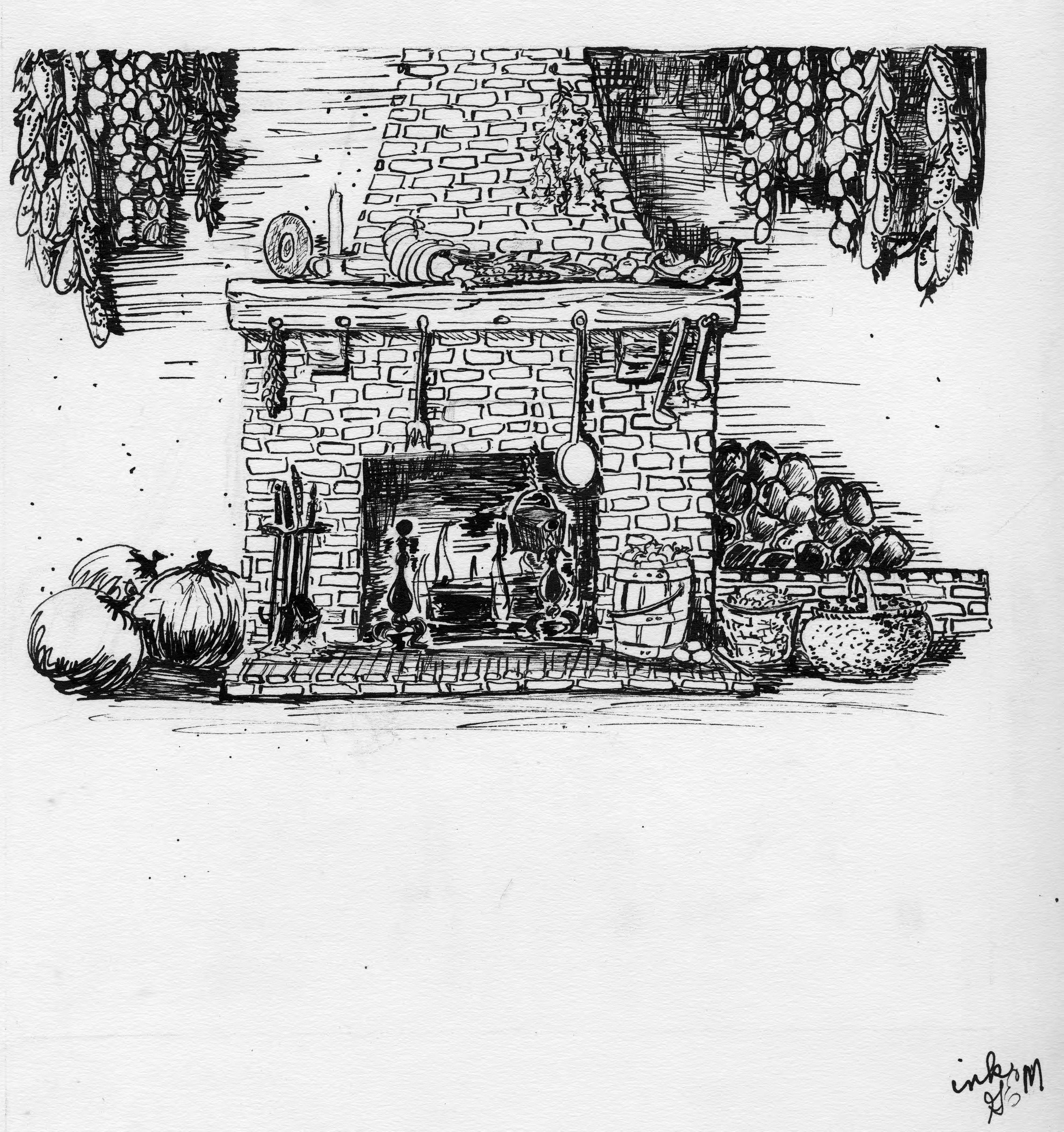 Sketch of a kitchen fireplace at harvest time, with a cornucopia on the mantel. This is a sketch, not a cut out of an advertisement, nor is it mounted on board like others in this collection although the paper is heavier.