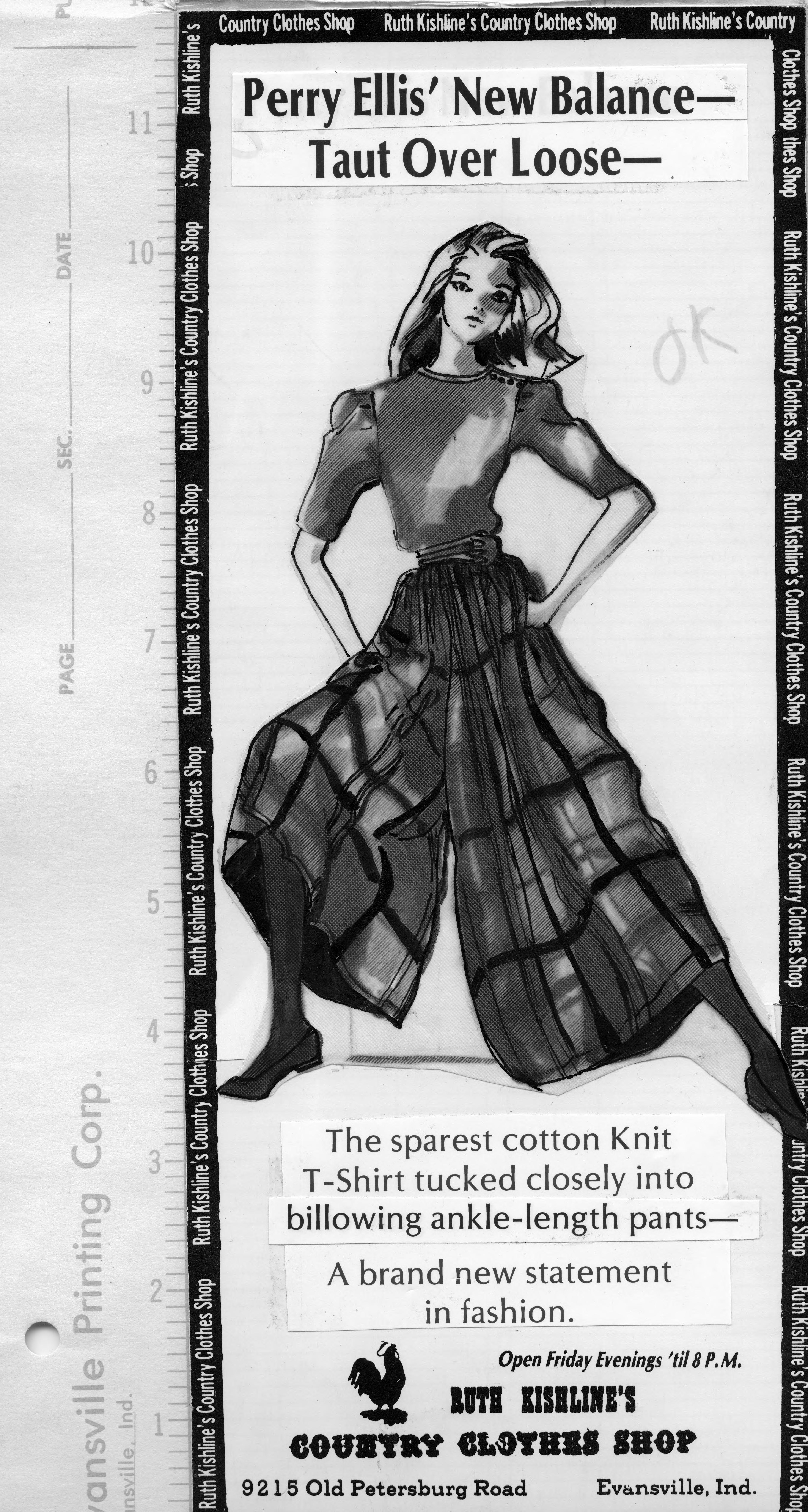 Sketch of a women searing a top and palazzo-style pants. This is the cut out of the advertisement, and the copy reads, Perry Ellis' new balance--taut over loose--The sparest cotton knit t-shirt tucked closely into billowing ankle-length pants--A brand new statement in fashion. The text also includes the name of the store, the address, and Friday hours. �Perry Edwin Ellis (March 3, 1940 � May 30, 1986) was an American fashion designer who founded his eponymous sportswear house in the mid-1970s. Ellis' influence on the fashion industry has been called a huge turning point because he introduced new patterns and proportions to a market which was dominated by more traditional men's clothing.�