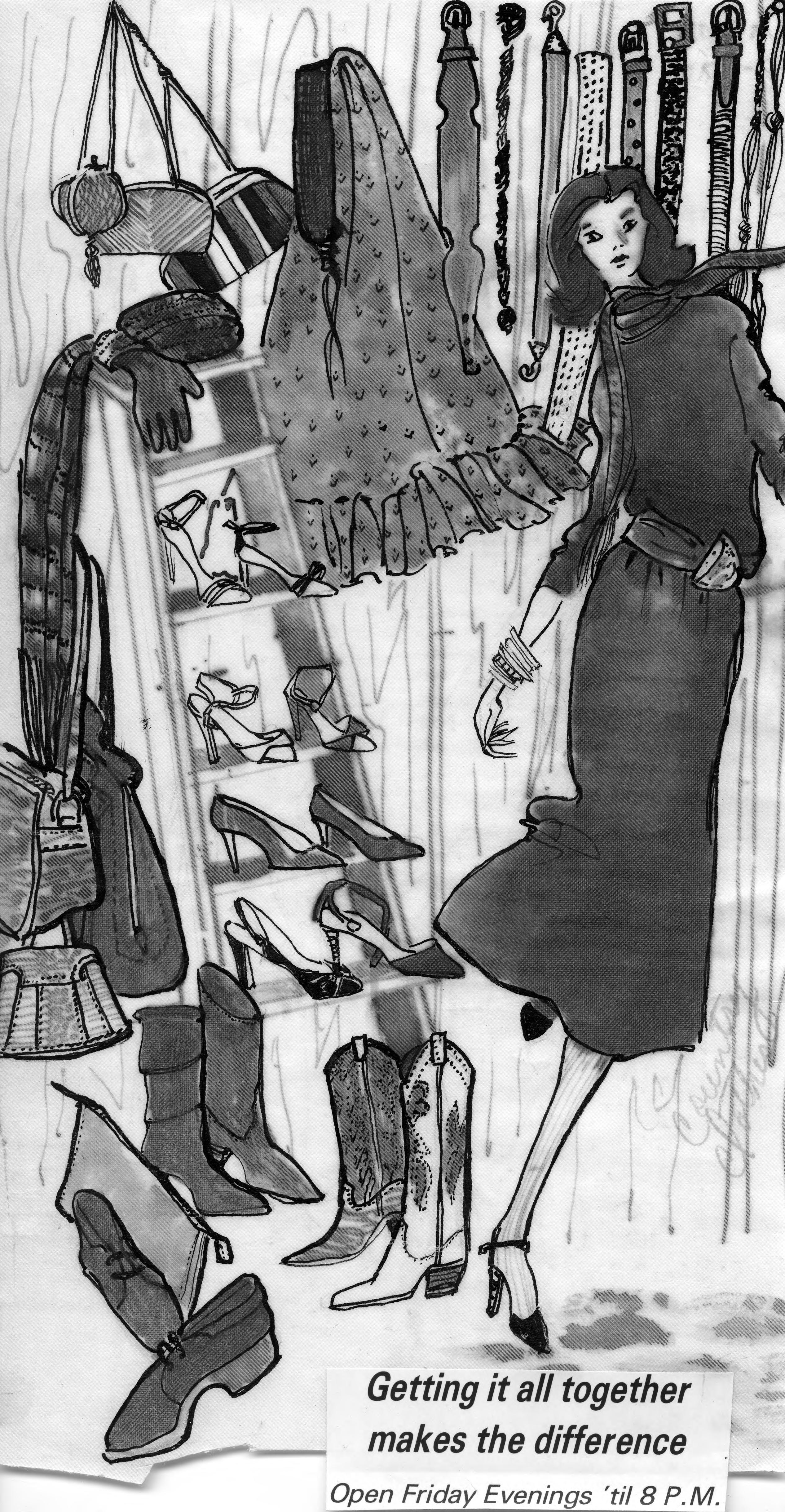 Sketch of a women wearing a long sleeved dress with scarf and belt, surrounded by belts, purses, shoes, belts, scarfs, etc. This is the cut out of the advertisement, and the copy reads, Getting it all together makes the difference. Open Friday Evenings 'til 8 P.M. NOTE: This is the cut out of the advertisement, but it is not mounted on board as others are.