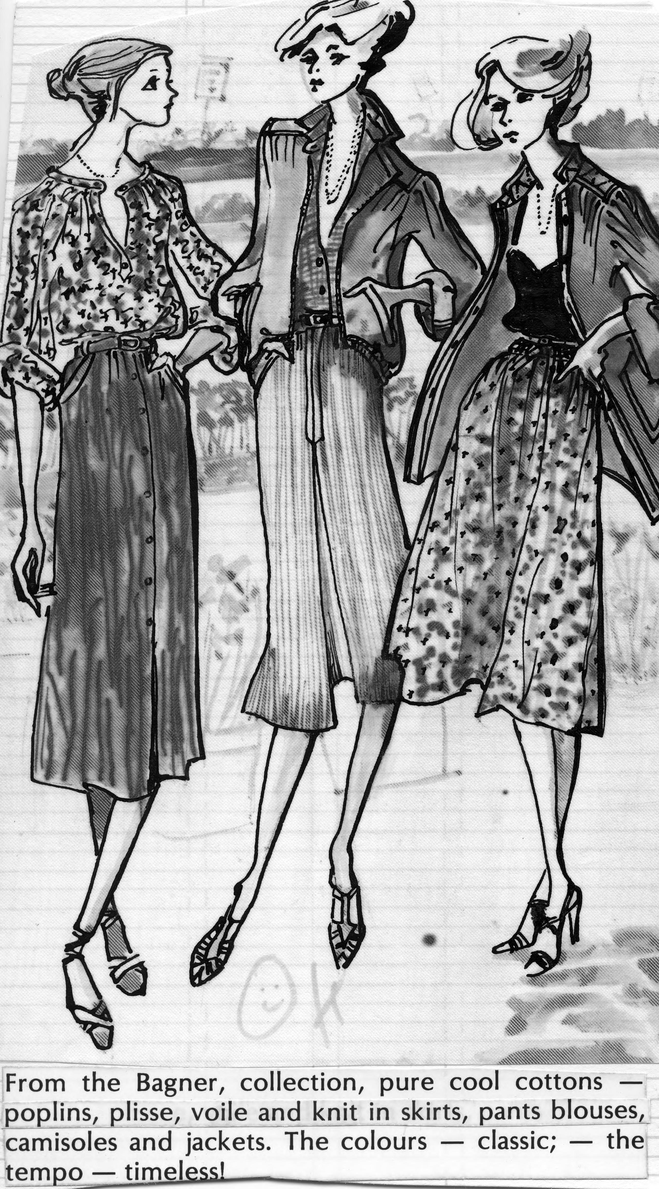 Sketch of 3 women wearing loose skirts and topcs, two with jackets. This is the cut out of the advertisement, and the copy reads, From the Bagner, collection, pure cool cottons--poplines, plisse, voile and knit in skirts, pants blouses, camisoles and jackets. The colours--classic;--the tempo--timeless!