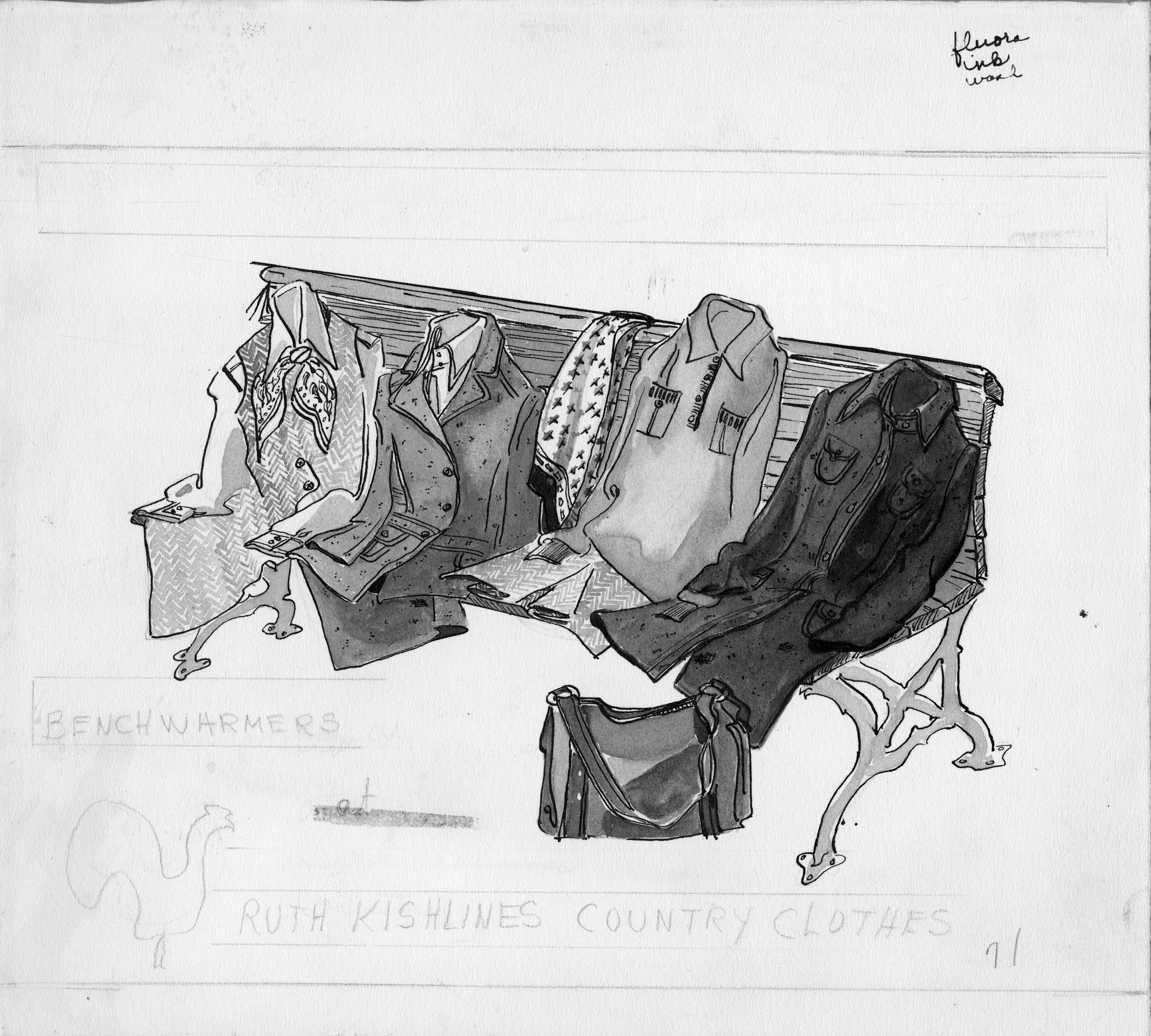 Sketch of 4 outfits laid on a bench--a herringbone-patterned jumper with long sleeved-blouse and scarf tied under the collar, a suit with a peplum, a scarf, a long sleeved sweater with button placket and breast pockets over a skirt in a herringbone pattern, a coat that is probably almost knee length, and a handbag sitting on the ground. The advertising copy reads, Benchwarmers at Ruth Kishline's Country Clothes.