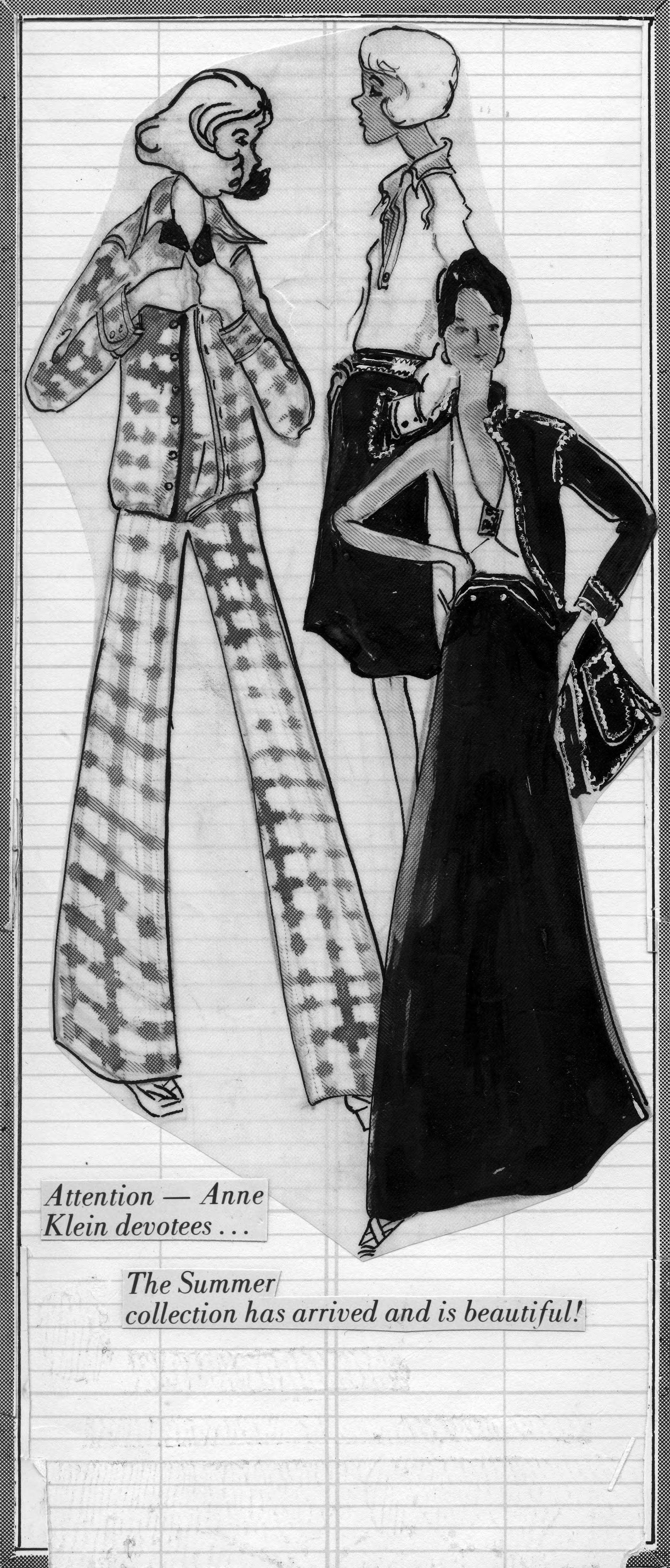 Sketch of a 3 women wearing separates--one a plaid pantsuit with wide legs and the hip length jacket gathered at the hem. One has on a long-sleeved polo shirt with knee-length skirt and belt. The last has on an floor length skirt with matching below-the-hips jacket and a halter top with a decorative accessory at the bottom of the V-neck. This is the cut-out of an advertisement, and the copy reads, Attention--Anne Klein devotees--The Summer collection has arrived and is beautiful. Anne Klein (August 3, 1923 - March 19, 1974) was an American fashion designer. Her birth name was Hannah Golofsky (it has also been written as Golofski). She changed her first name to Anne, and took Ben Klein's last name when she married him in 1948.. She was the first fashion designer after Coco Chanel to adapt men's clothing styles into how outfits were produced and designed for women.